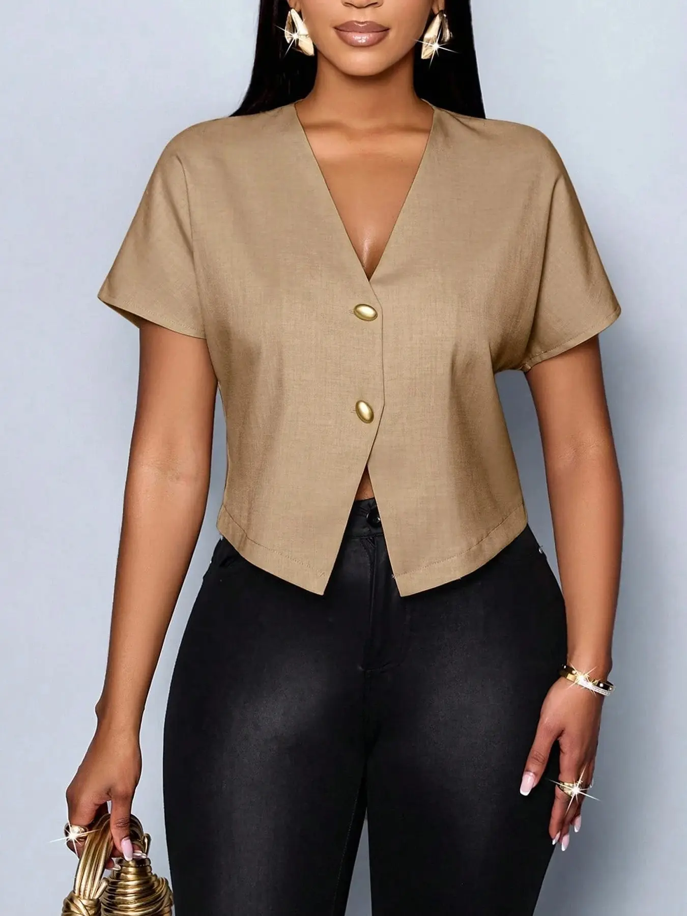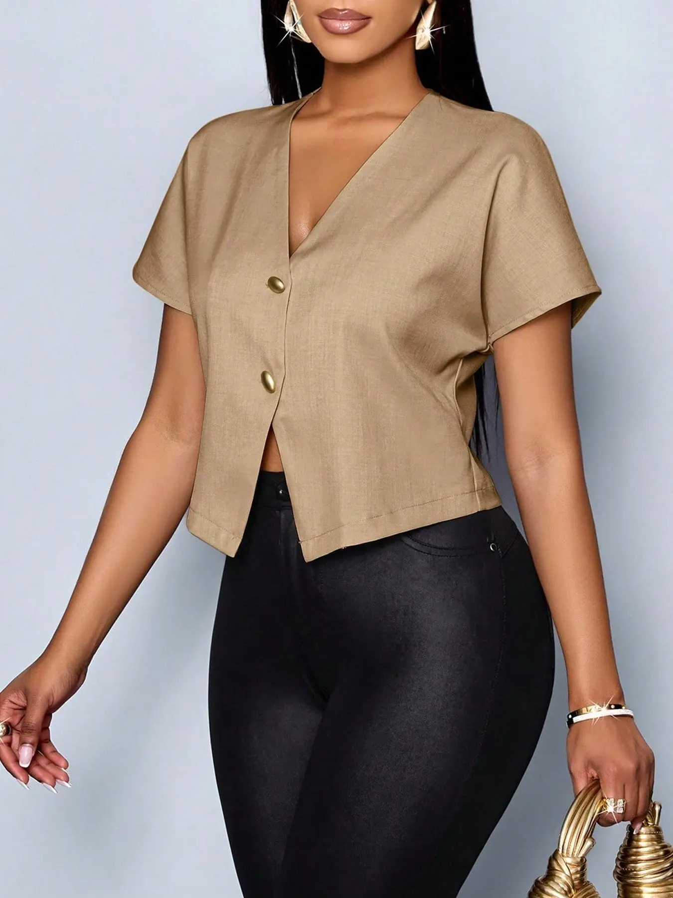 1 piece Women's Solid Color V-neck Short-sleeved Shirt Top, suitable for commuting, stylish and elegant #tiktokshopcreatorpick #ootdinspiration #ootdinspo #ootdideas #ootdfashion @Ophelia Muse