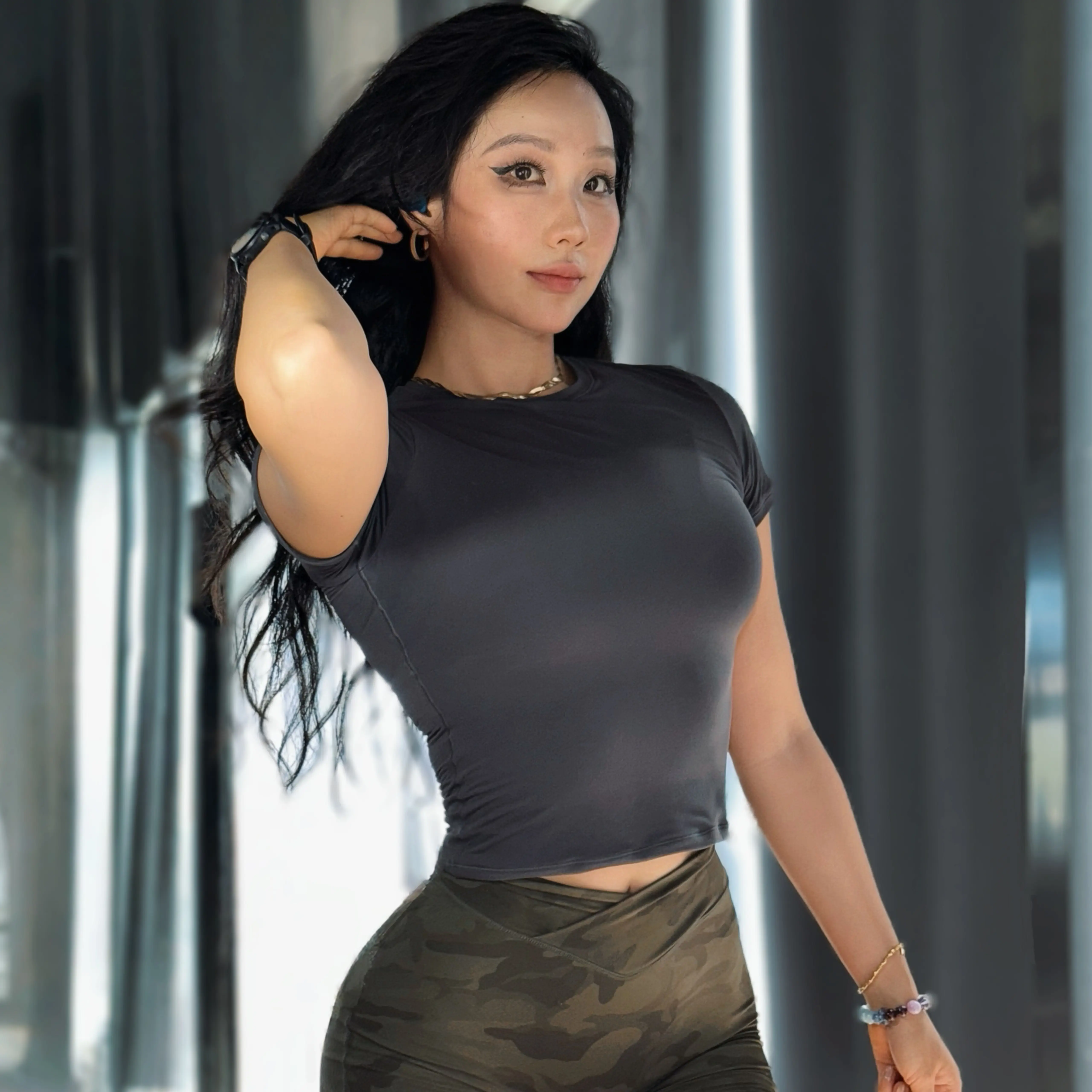 This compression workout top is crafted from 75% nylon and 25% spandex, ensuring stretchy and multiple-layered comfort. It fits snugly, avoiding visible bra lines or back rolls. Size up if you prefer a looser fit. The top's high elasticity makes it perfect for gym sessions or casual outings. Stay stylish and comfortable in this trendy Y2K design.