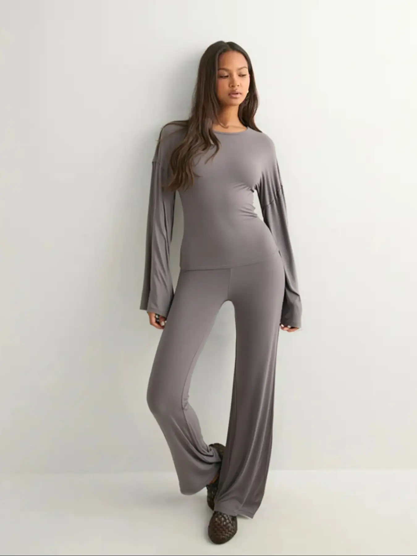 very cutesy and form fitting. perfect for comfy/ cute vibes. gives classy cus of the sleeves too. i’m 5’8 and got an xs and the pants go to a good length. could be a taddd longer but cute regardless