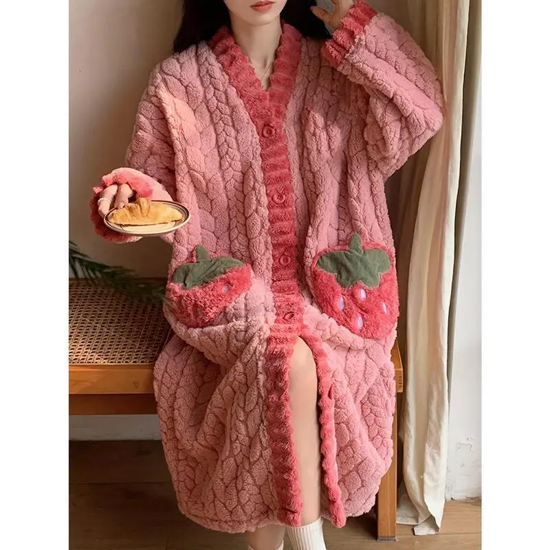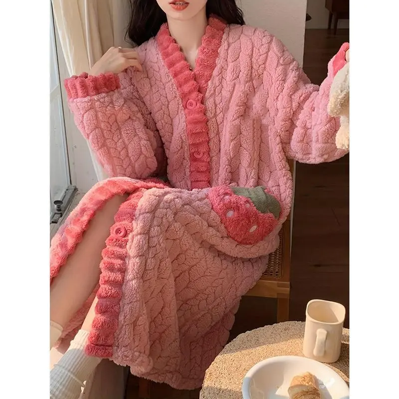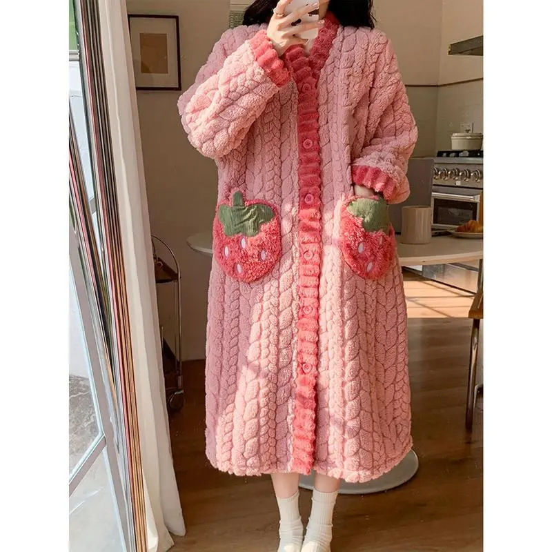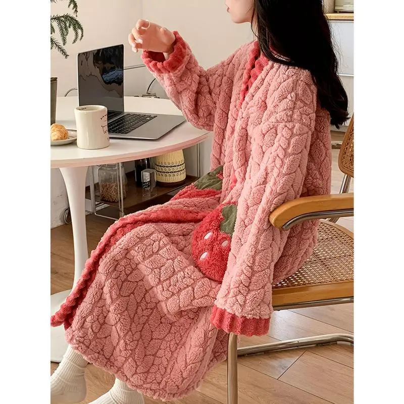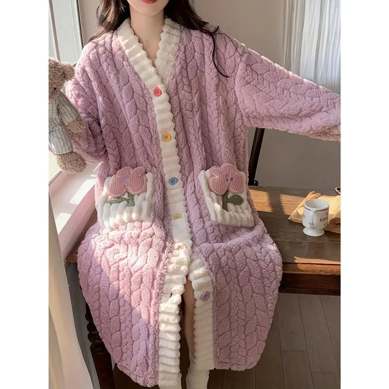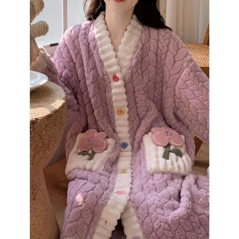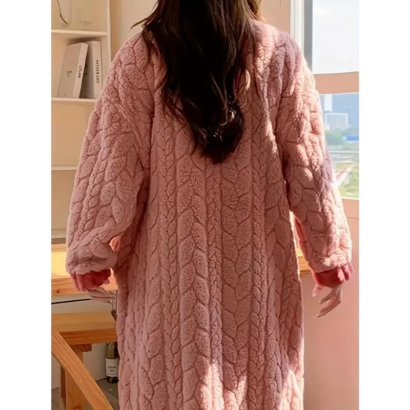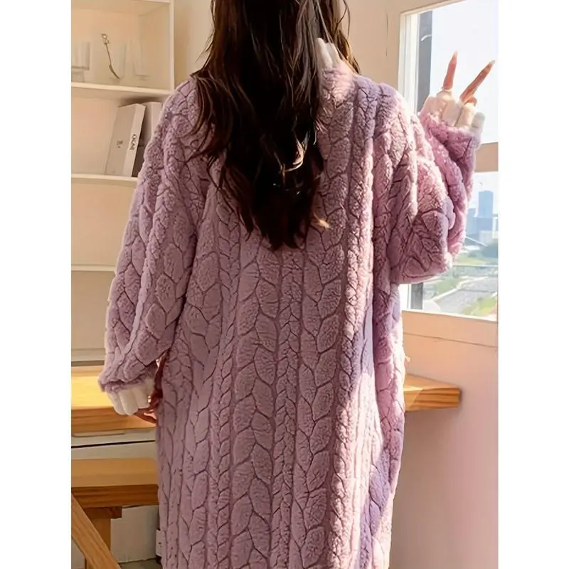Women's Fleece Coral Fleece Long Nightgown - V-neck Button Design with Pockets, Comfortable Winter Homewear, Christmas Thanksgiving Mother's Day Gift, Machine Washable Casual Wear Womenswear Loungewear