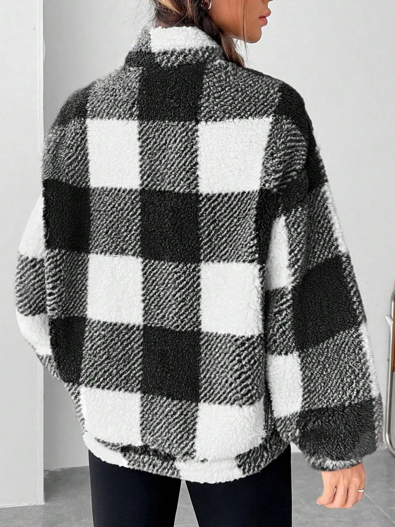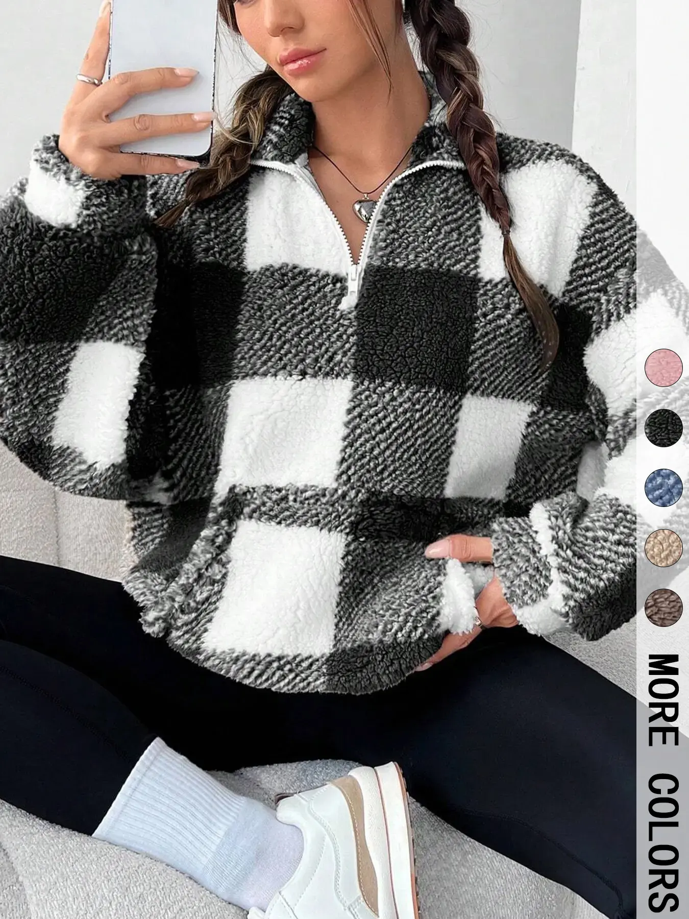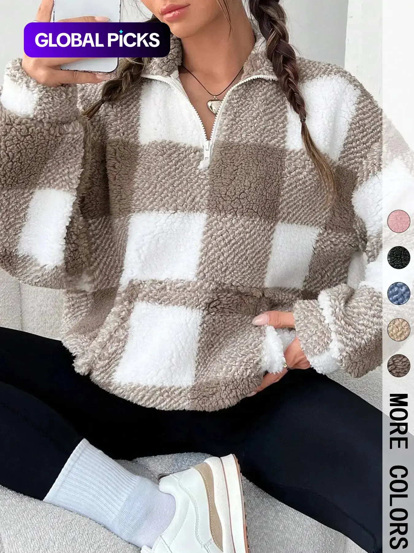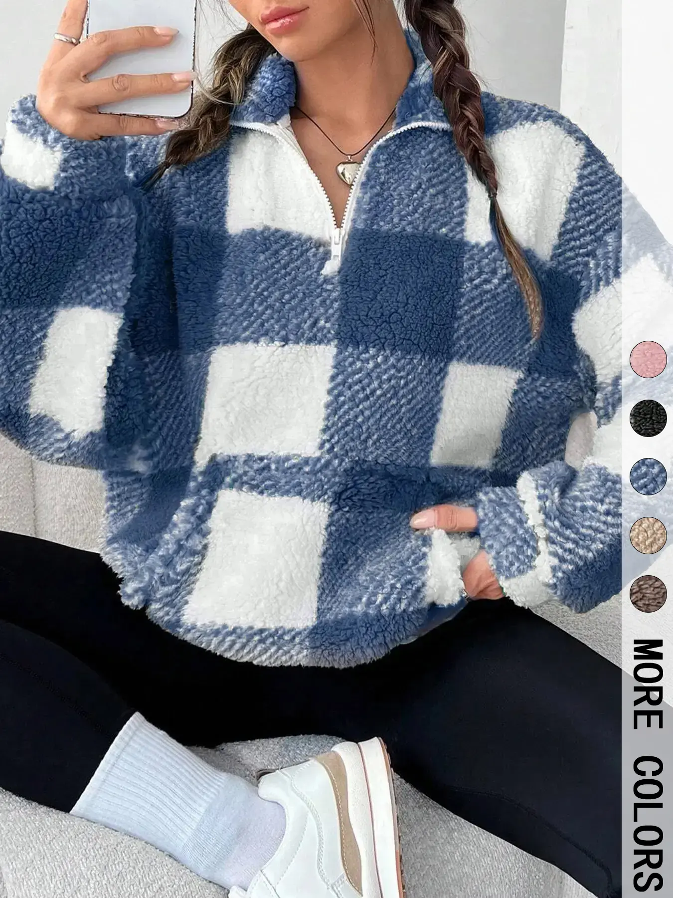Absolutely love the softness of this quarter zip Sherpa! Pink plaid color is sure to be a warm staple in your closet all year long