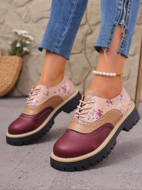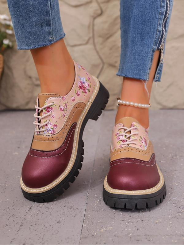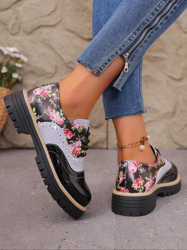 Women's Floral Patchwork Chunky Heel Platform Shoes, Adjustable Buckle Design, Casual PU Leather Sneakers for Daily Wear & Office