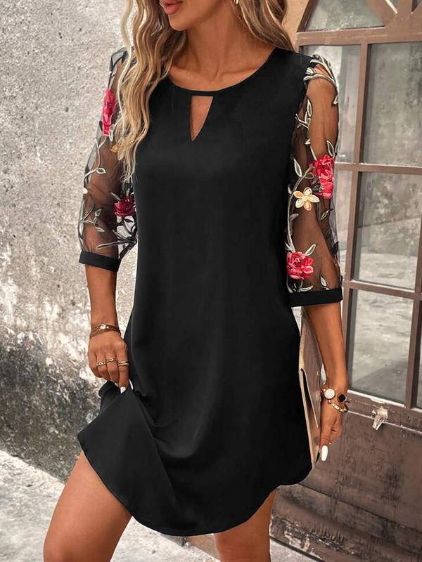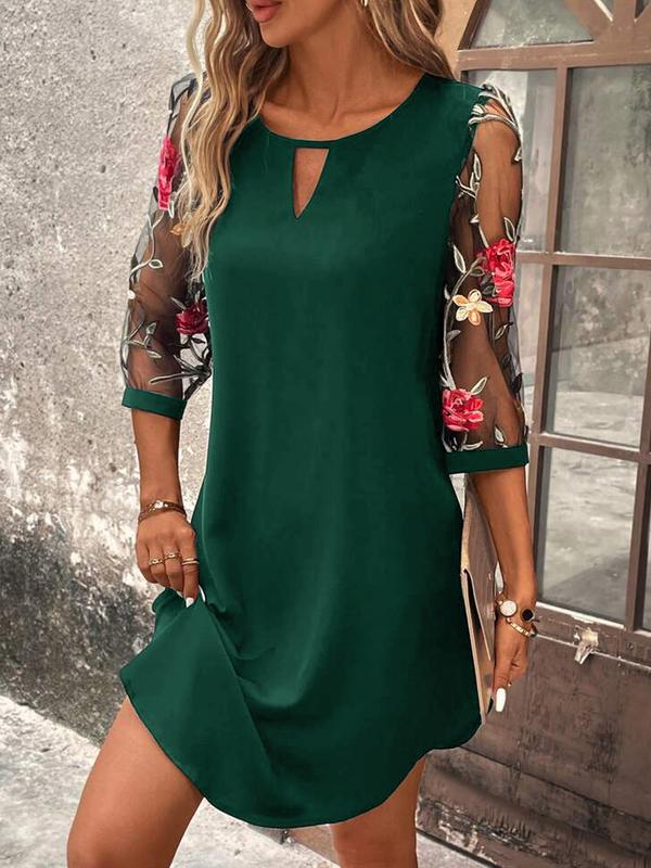 Women's Casual Elegant Floral Embroidered Half Sleeve Hollow Out Neck Dress, Perfect for Spring Summer, Stylish and Comfortable