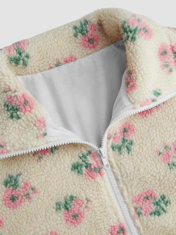 Women's Floral High Neck Zipper Jacket, Casual Fleece Lined Coat, Long Sleeve Button Front Outerwear, Fall & Winter Fashion