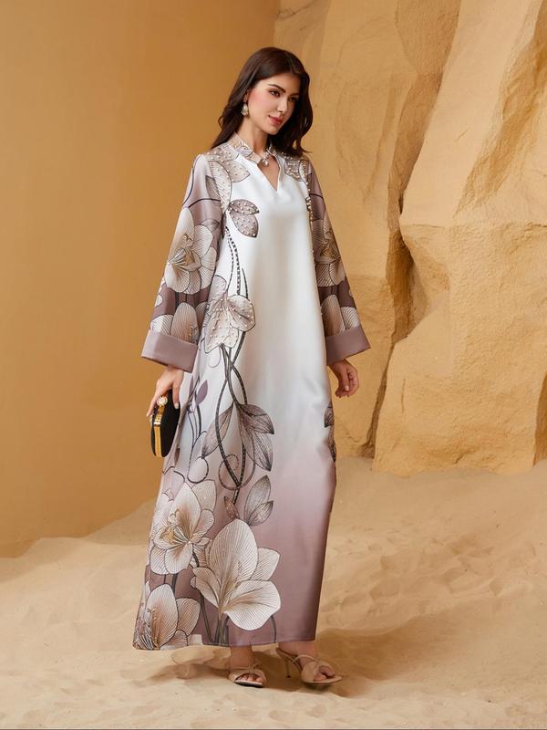 Women's Floral Pattern Long Dress, Floral Print Abaya, Elegant Modesty Long Sleeve Maxi Arabic Clothing, Ladies Islamic Clothing for Daily Wear