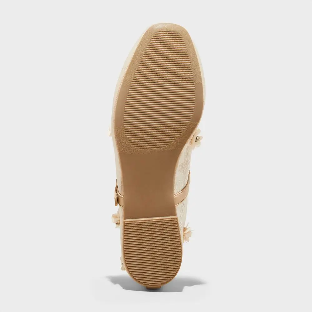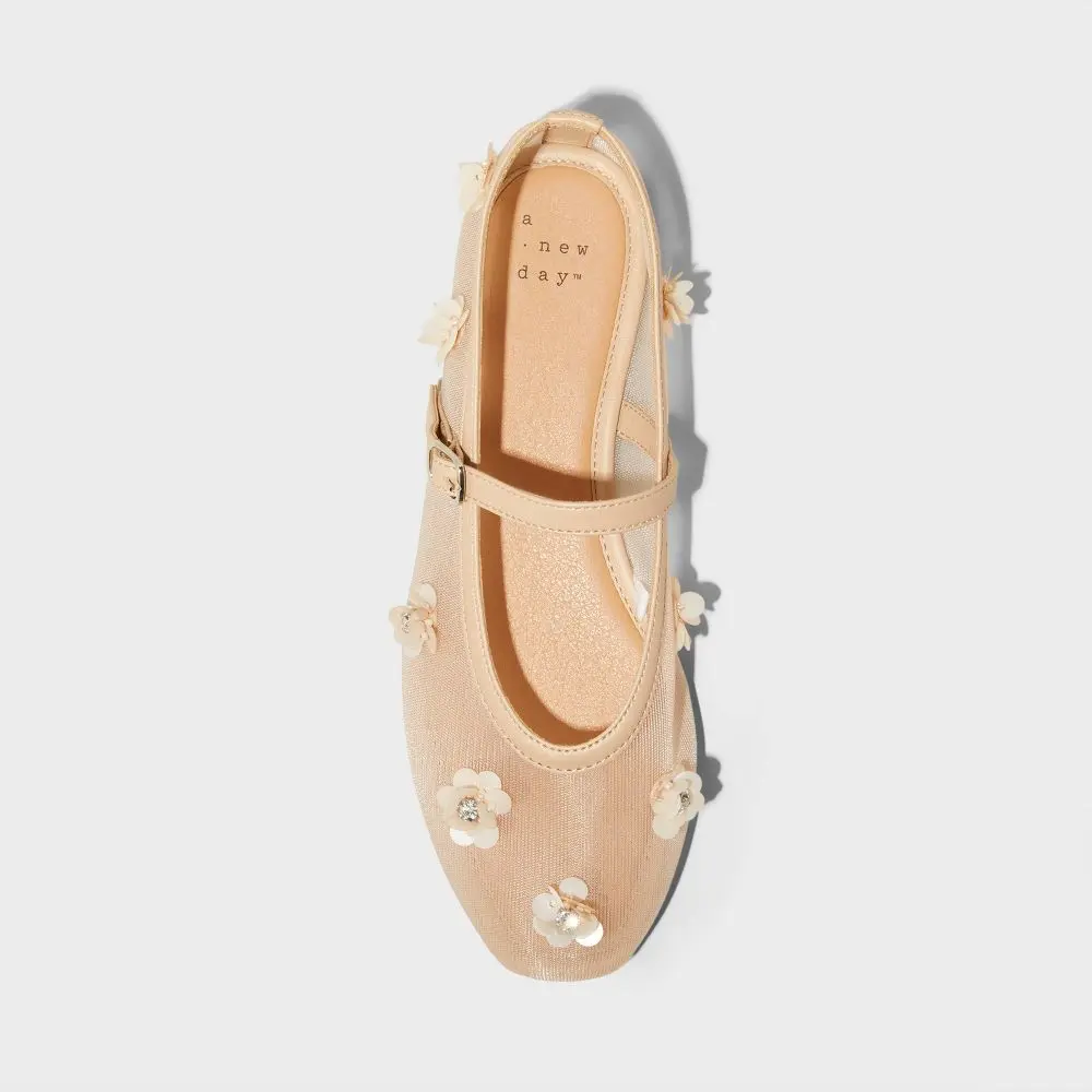 Add floral accents to your footwear collection with the Everly Floral Mesh Mary Jane Ballet Flats with Memory Foam Insole from A New Day. These ballet flats feature a mesh design with floral and stone detailing for a sweet look. Designed with a closed toe and flocked outsole, these flat sandals have a memory foam insole for comfortable wear, while the instep strap with a buckle closure offers a nice, secure fit.