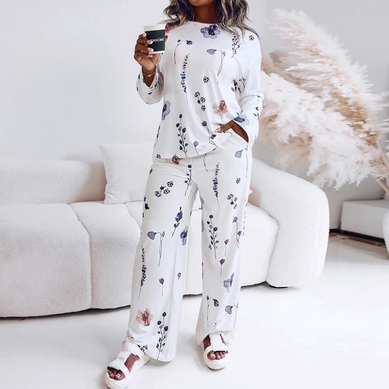 ChicMe Women's Floral Print 2 Piece Matching Set Long Sleeve Round Neck Top & Casual Pants with Pockets Comfortable Womenswear