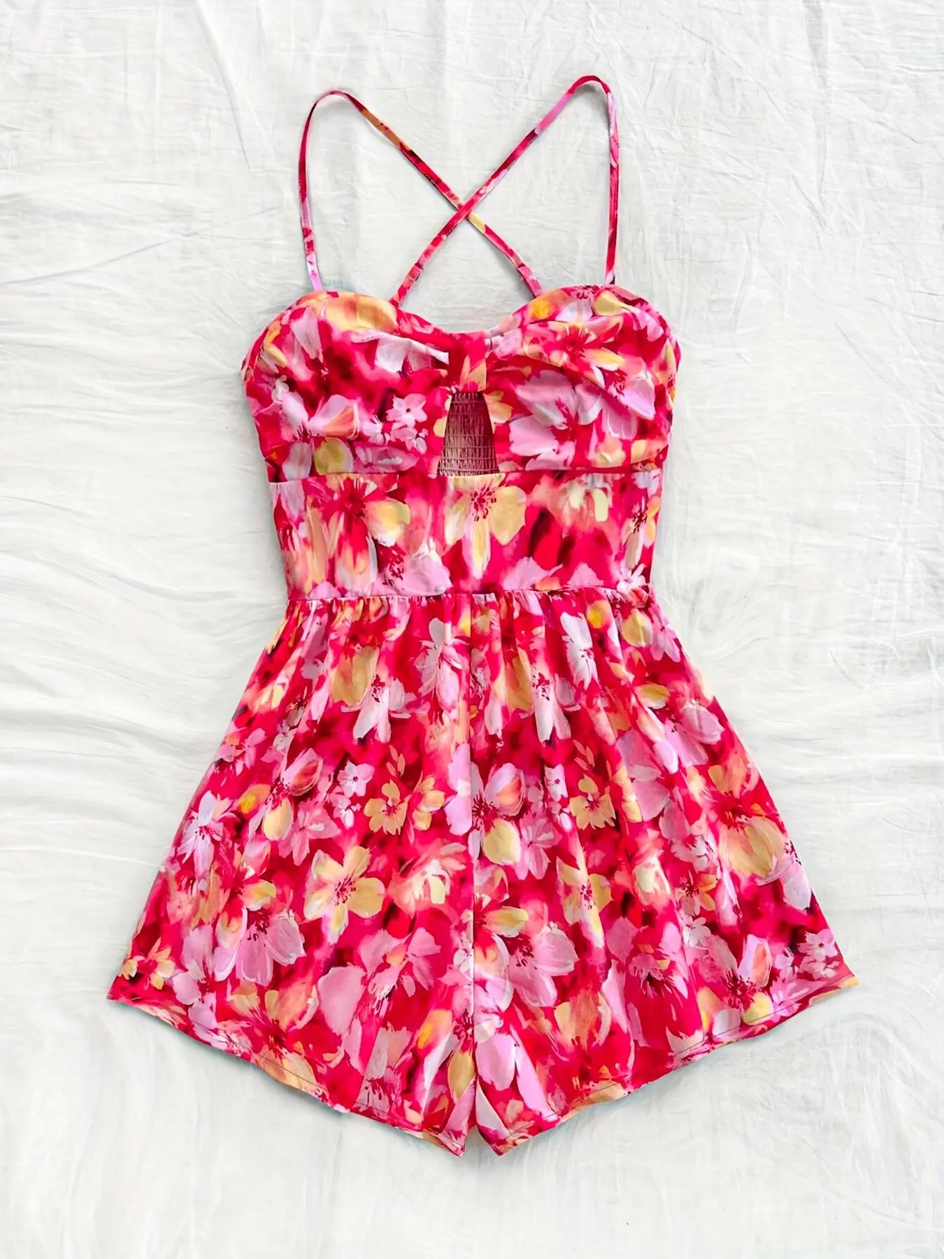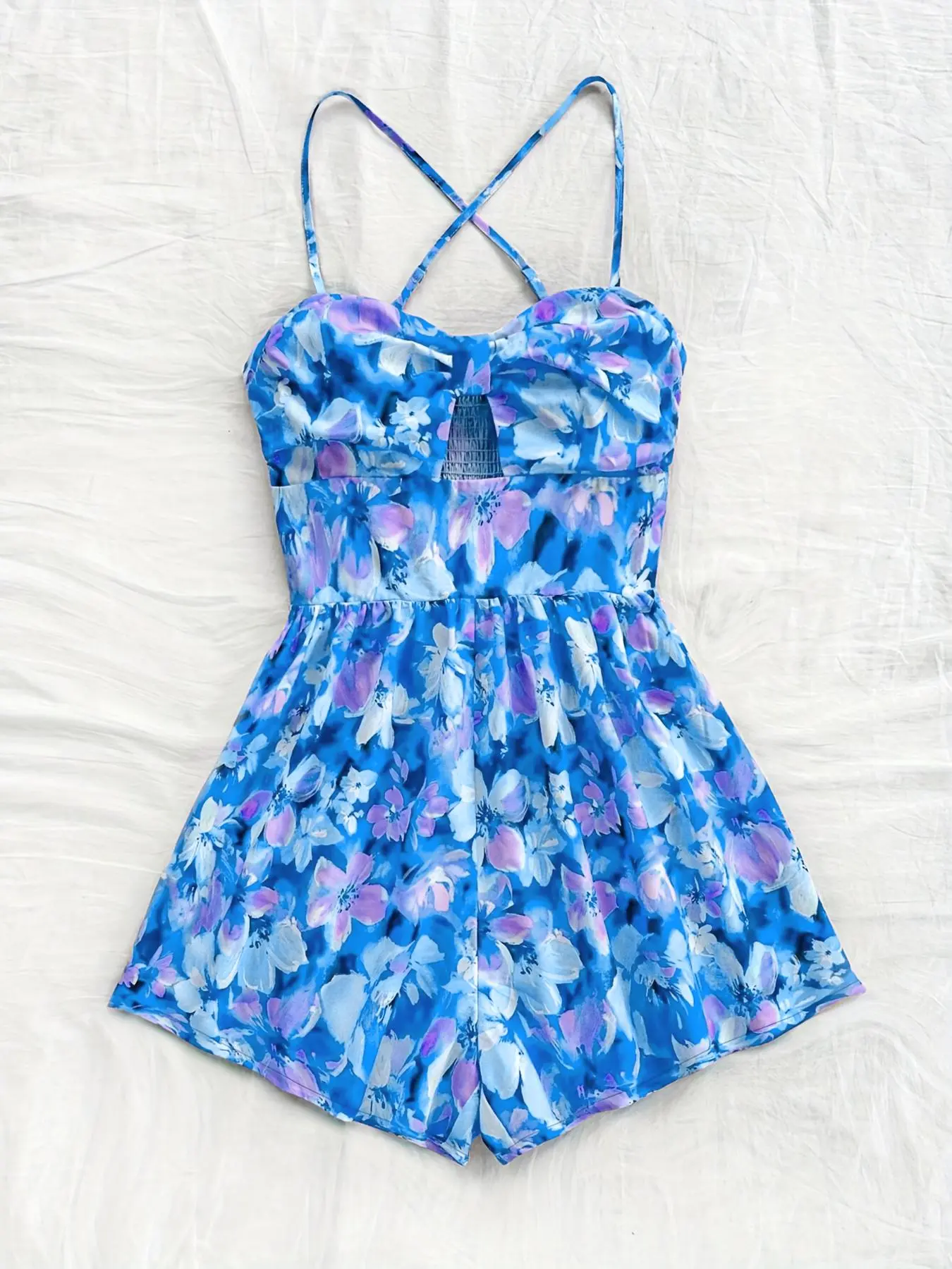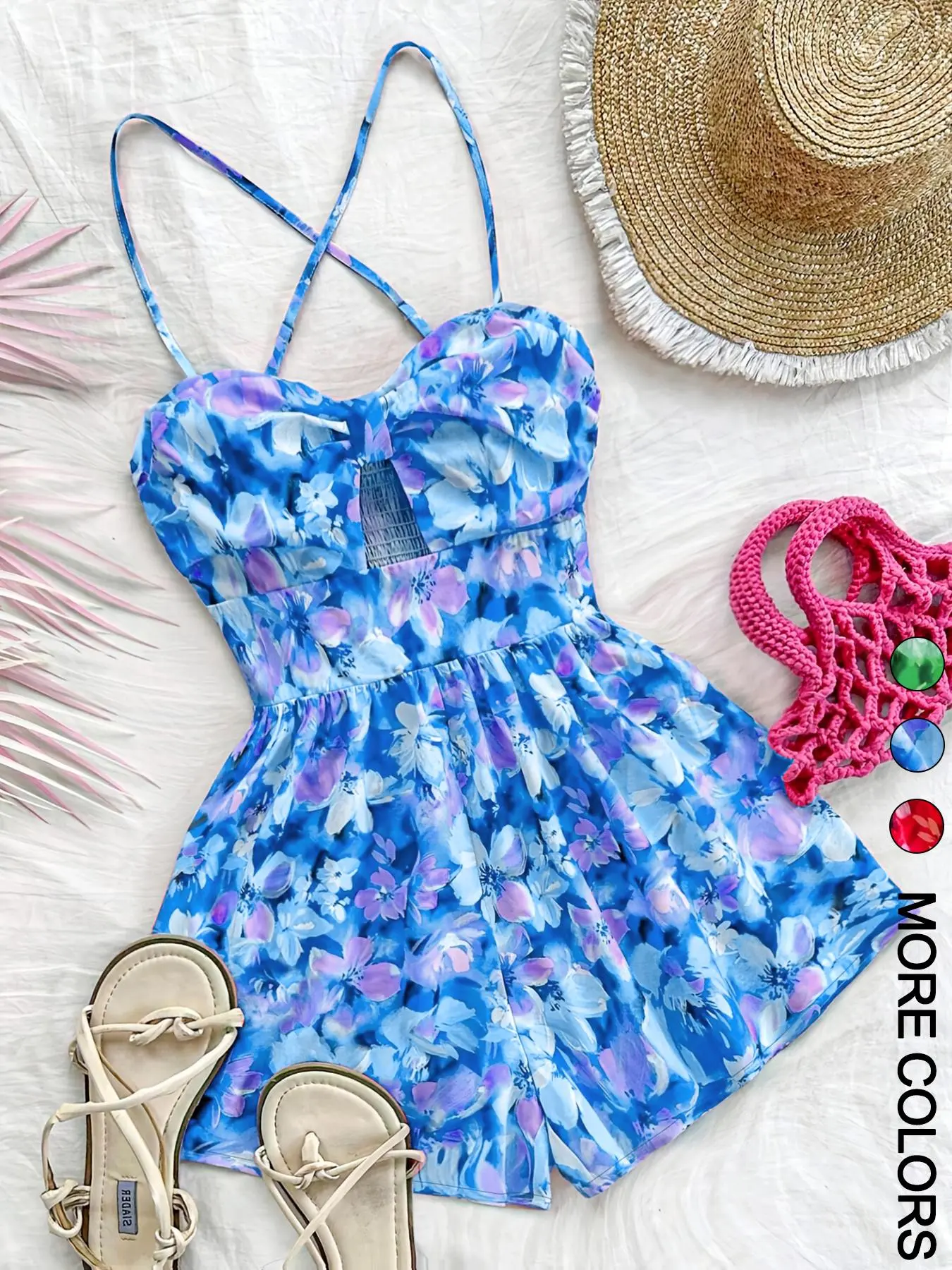 5. Women's Floral Print Cut Out Fitted Romper, Casual Sleeveless Romper for Summer, Fashion Women's Clothes for Beach Holiday Vacation