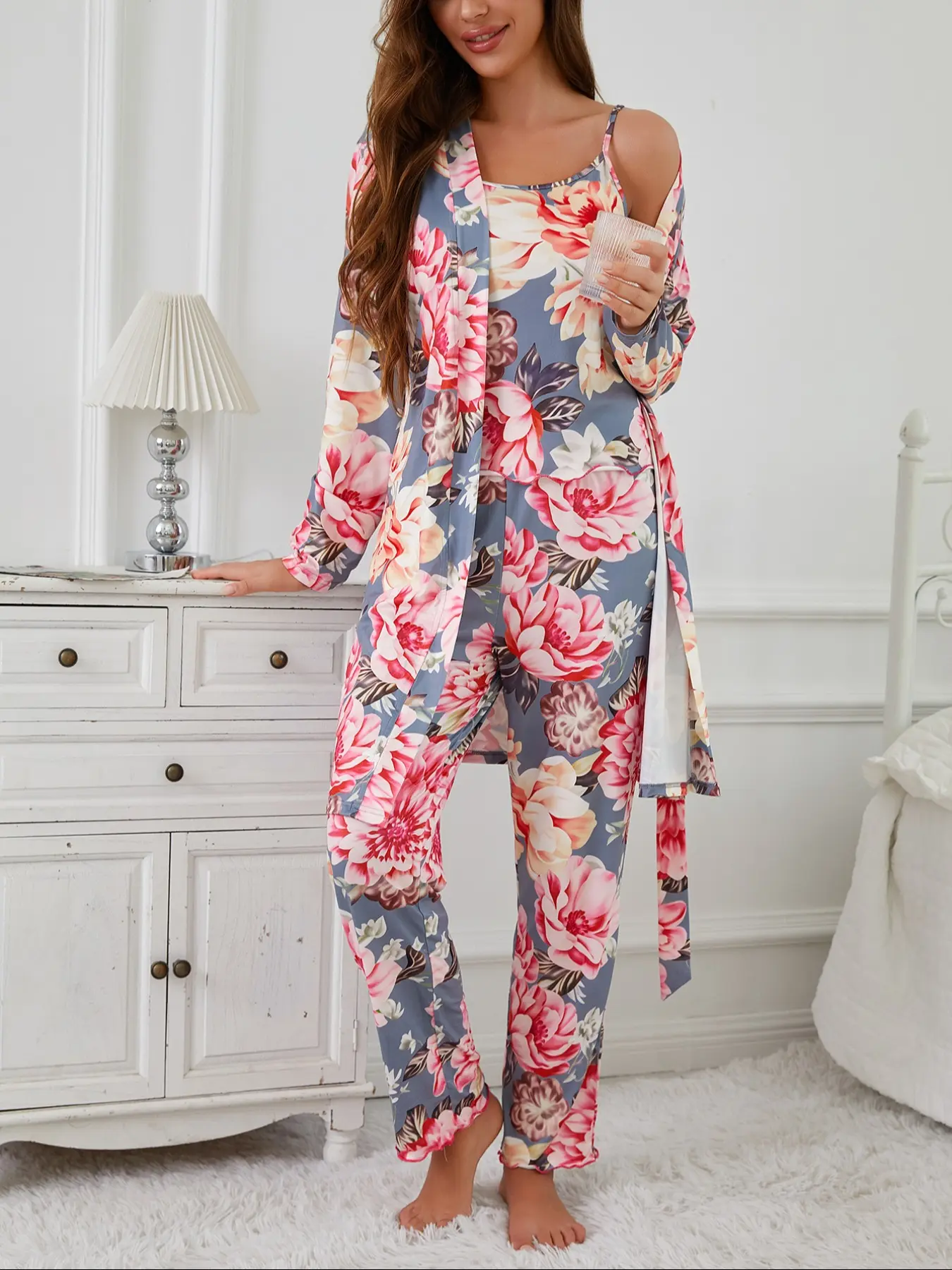 Floral Print Women's Robe Set + Strap Pants Three-Piece Comfortable Sleepwear Suit, Pajamas, Casual Home Wear for All Seasons