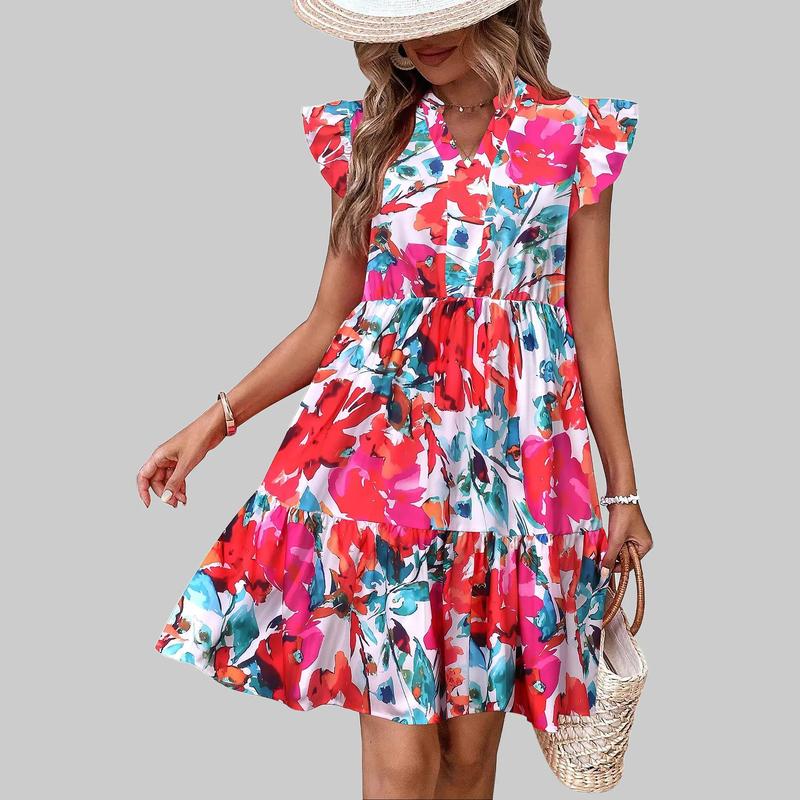Women's Floral Printed Dress: Ruffle Sleeve Tiered Mini Dress
