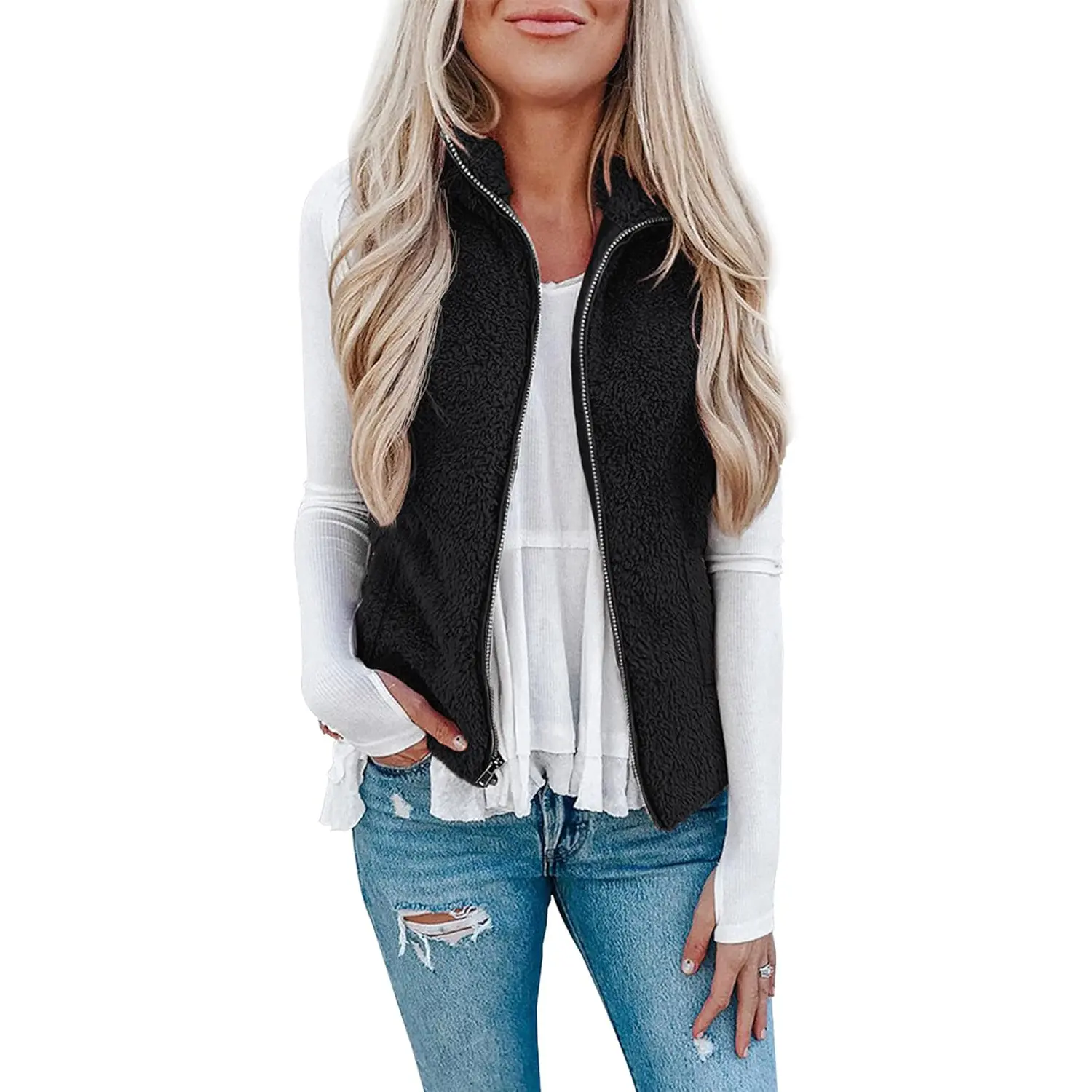 Womens Fuzzy Sherpa Fleece Jacket Lightweight Vest Cozy Sleeveless Cardigan Zipper Waistcoat Outerwear with Pocket
