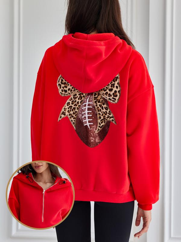 ✨ Elevate your game day style with this women's football sequin hoodie. It features an adjustable drawstring hooded collar, half zipper, and long sleeves. The front kangaroo pocket adds convenience. This oversized fit pullover is perfect for tailgating. Made with soft, light material, it's both fashion and comfy.