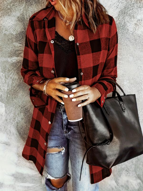 Women's Gingham Shirt, Casual Loose-Fitting Long Sleeve Top, Woven Fabric, All Seasons Wear, Moderate Thickness