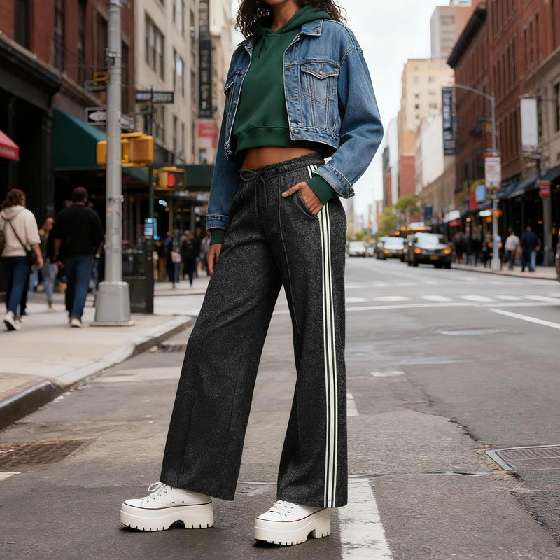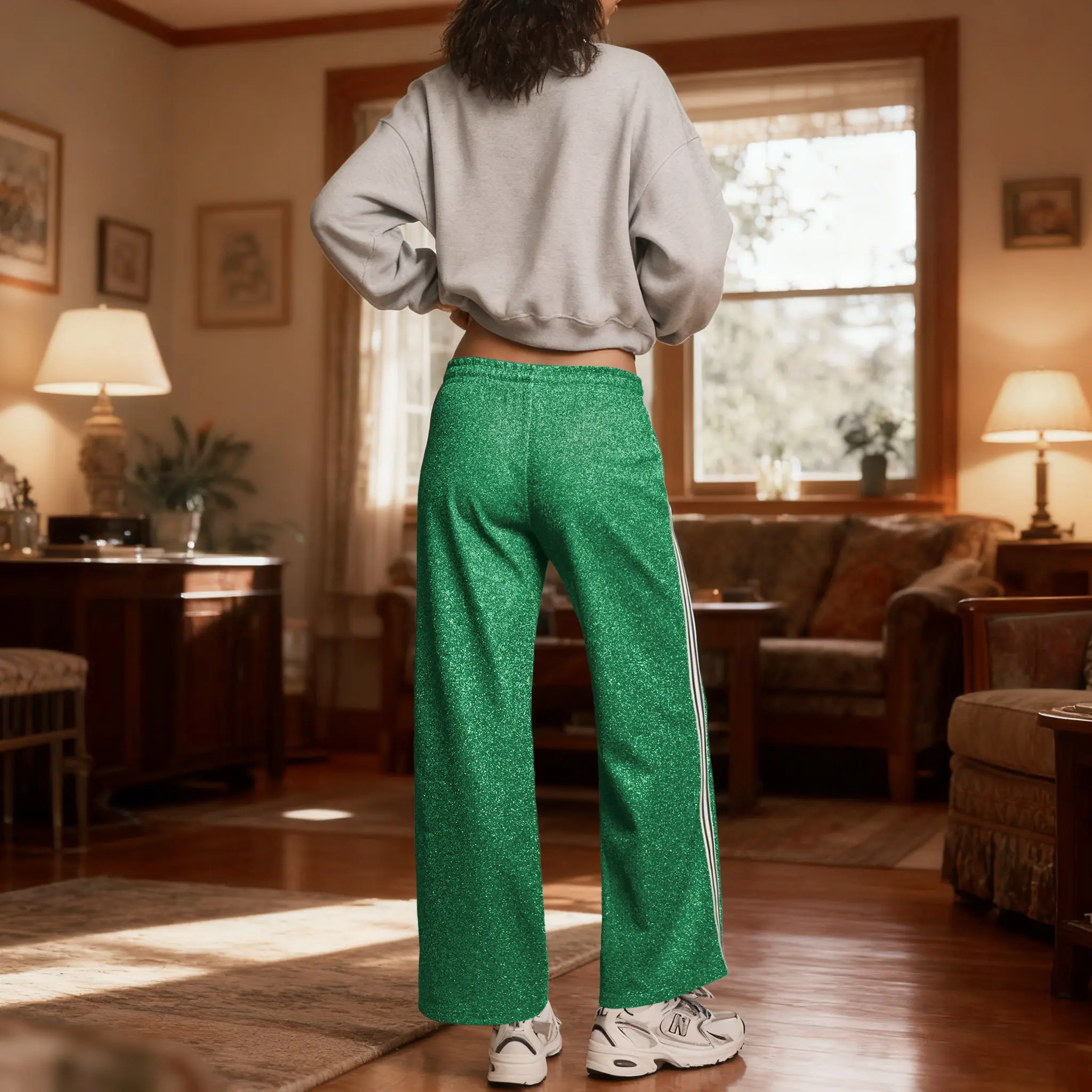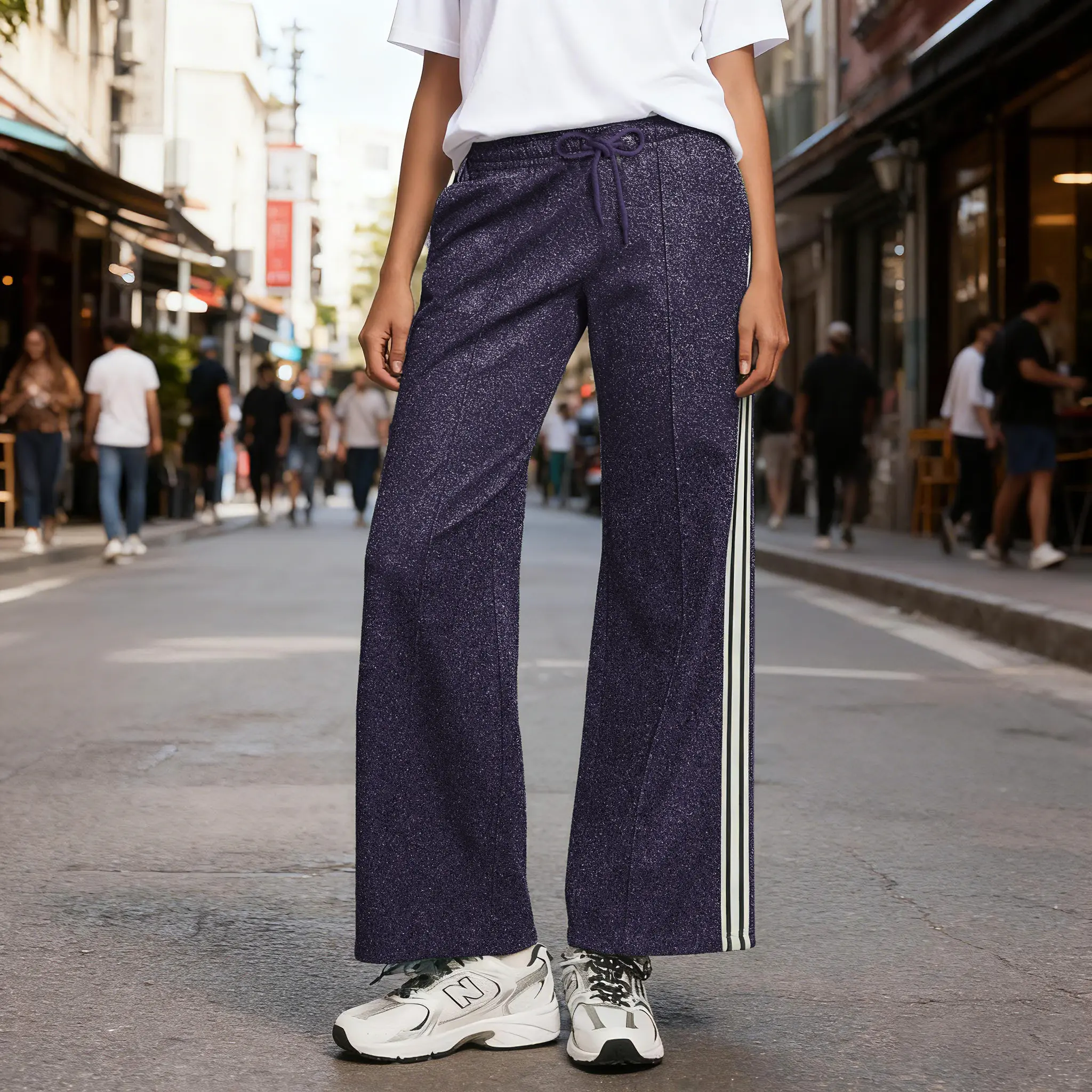 Features an elastic waistband with an adjustable drawstring for a flexible fit. Easy to pull on and off, offering unrestricted movement. Perfect for daily wear or casual outings. Crafted from a subtly sparkly material, delivering eye-catching style and a soft, comfortable feel. Ideal for standout looks.
