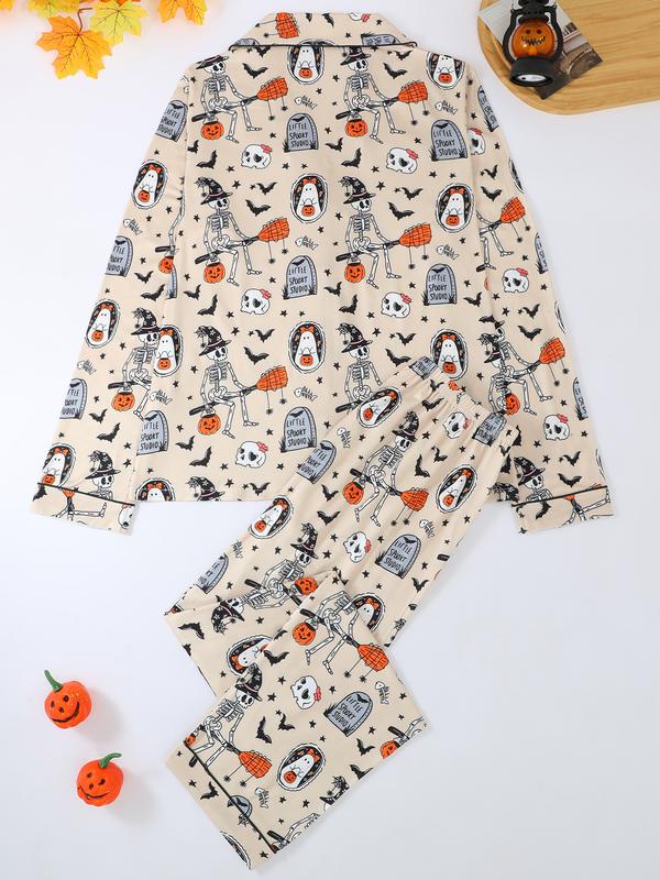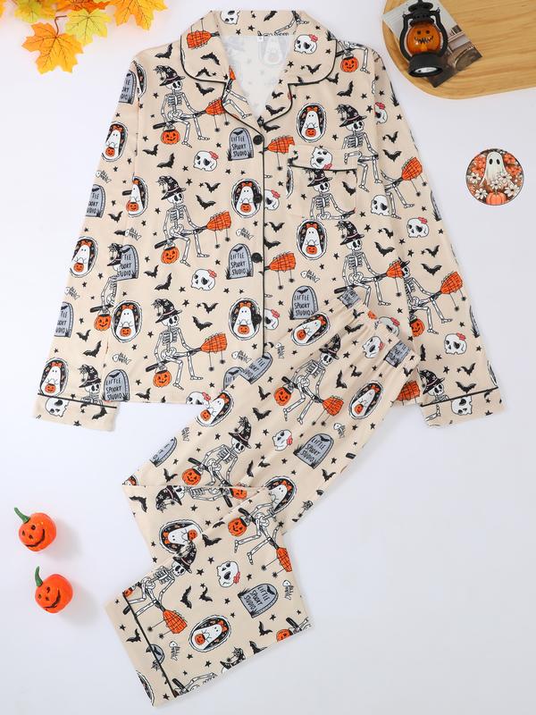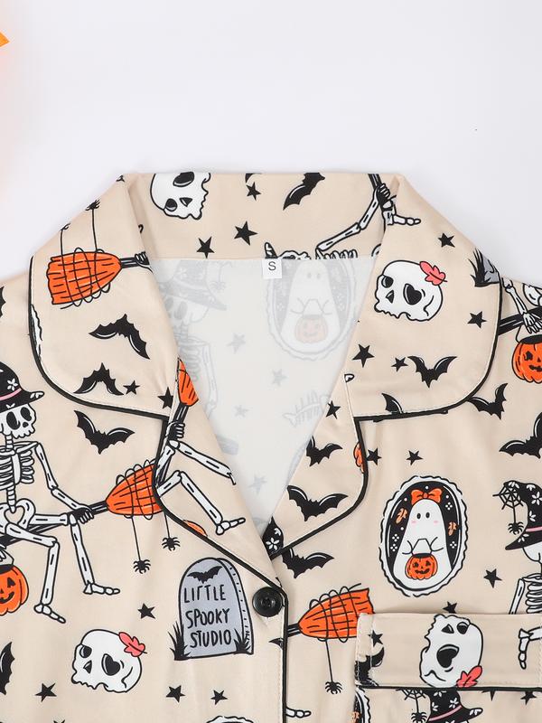 Women's Halloween Pumpkin Bat Print Pajama Set, Lapel Long Sleeve Cardigan & Elastic Waist Pants, All Seasons Sleepwear Home Wear