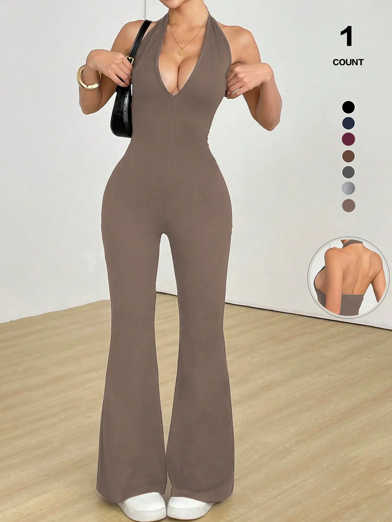 Women's Halter Neck Jumpsuit, Sleeveless Deep V Backless Chic Design, Flare Leg Romper for Casual Wear