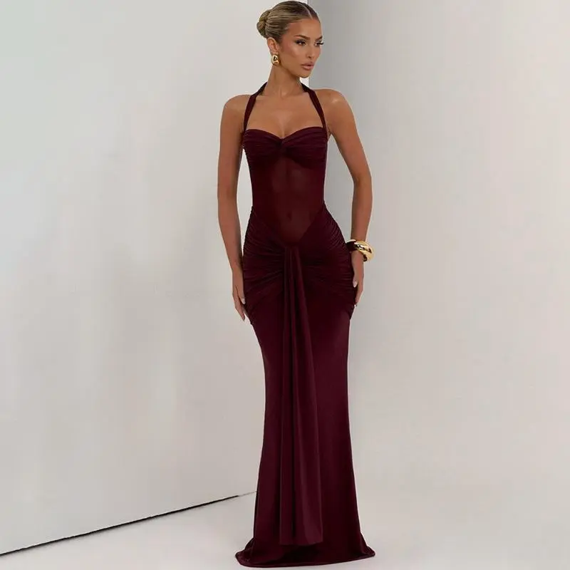 5. 2025 New Halter Neck Lace-Up Mesh Patchwork Ribbon Long Dress European American Style Formal Elegant Fashion Womenswear Basic Minimalist Sleeveless Womenswear(Raincoats)
