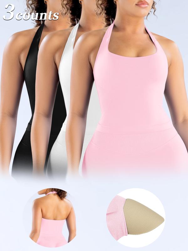 1/2/3 Pcs Women's Halter Neck Shapewear Tank Top with Removable Pads, Three-Layer Seamless Backless Tank Tops Casual Solid Color Soft All Seasons Wear