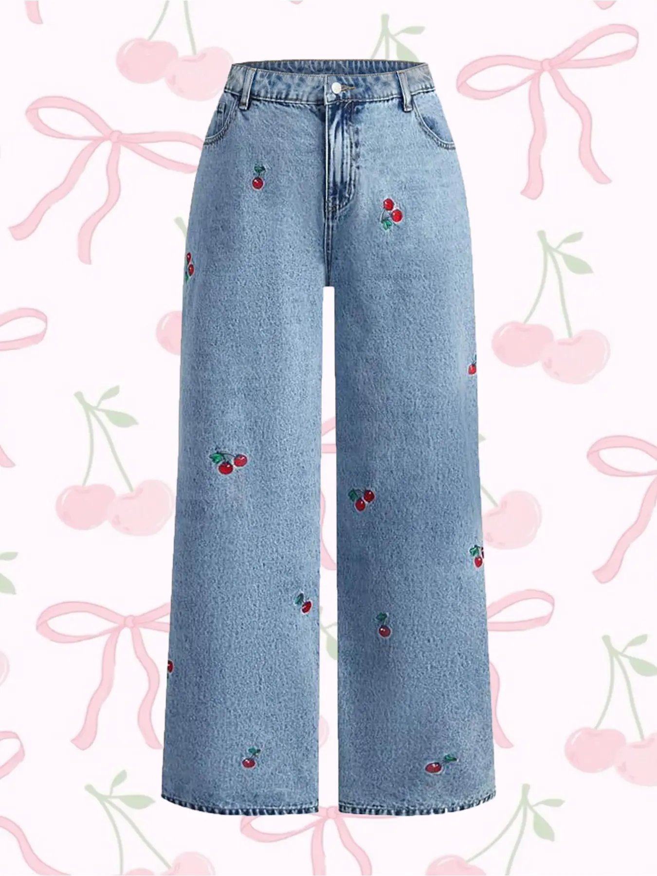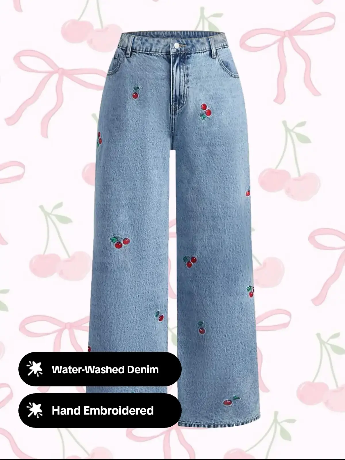 Cute jeans. They were alittle too big for me at the bottoms . The cherry are embroidered in the right places. Really cute . Short girl friendly. Someone over 5’4 I think would be crop style . Gave to sister in law . She loves them .