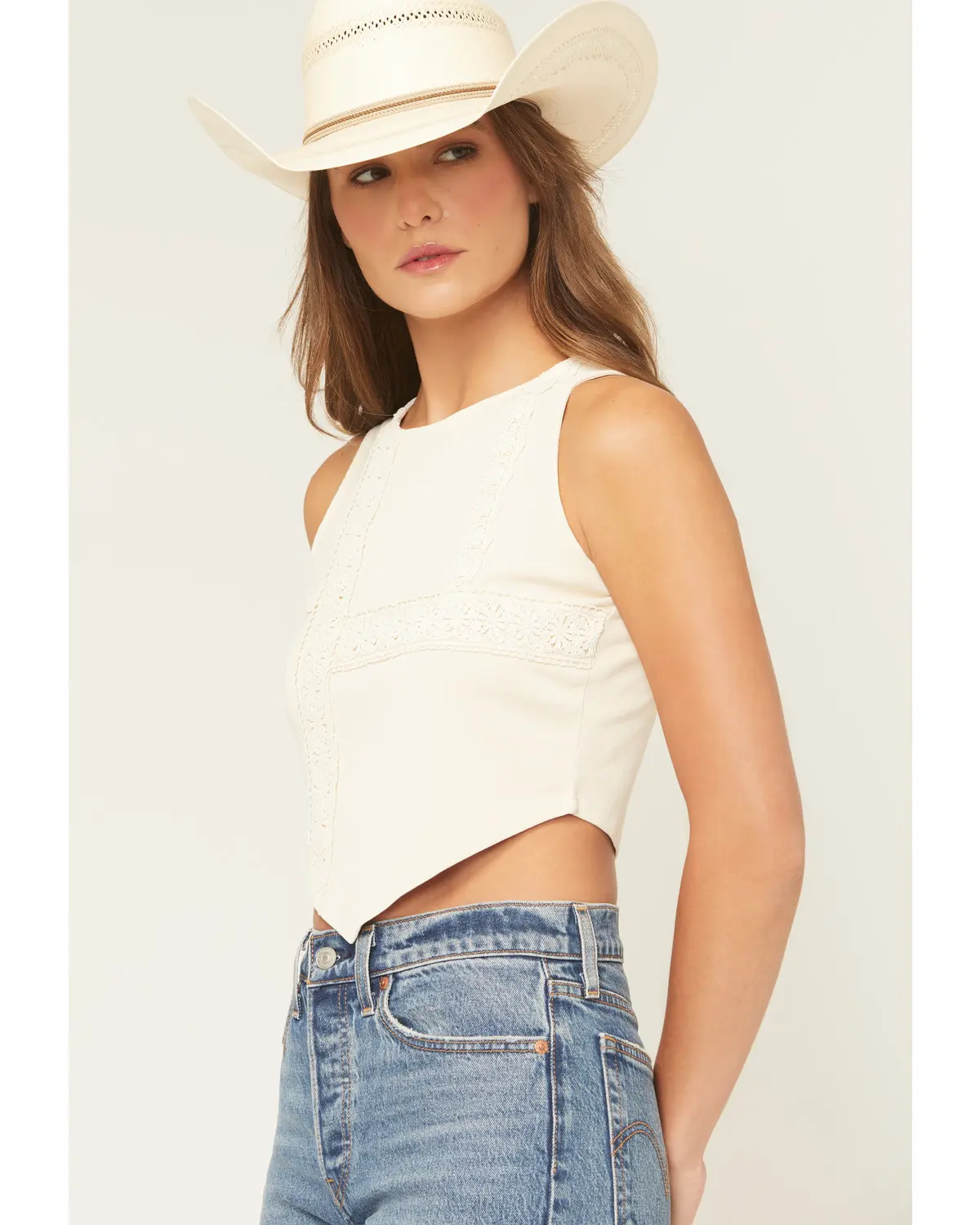 Model is 5'9" wearing a size small. Sleeveless. Handkerchief hem. Scoop neckline. Solid cream design. Floral lace inset panel details throughout. Imported.