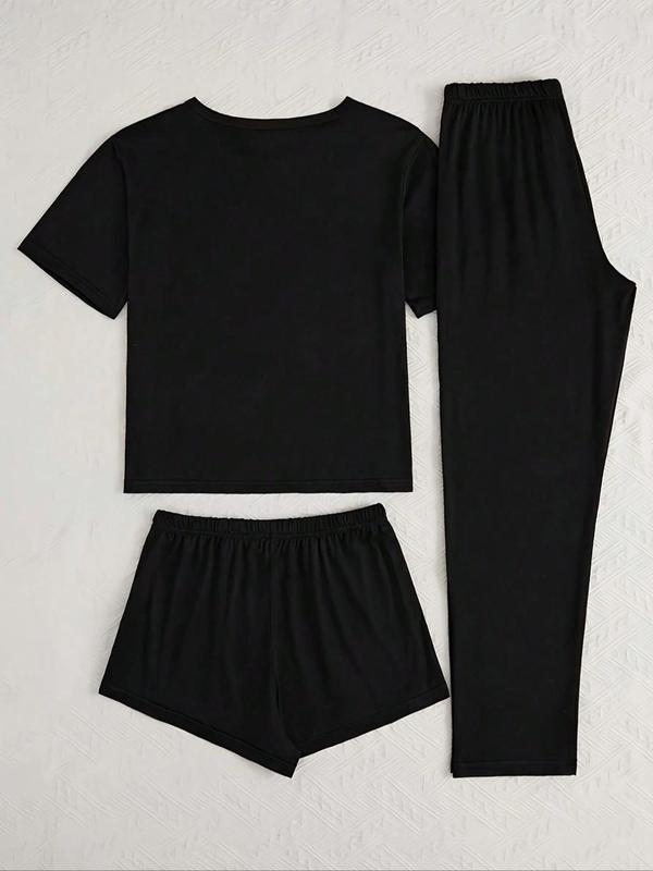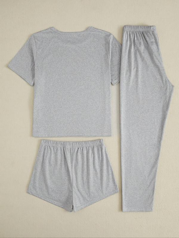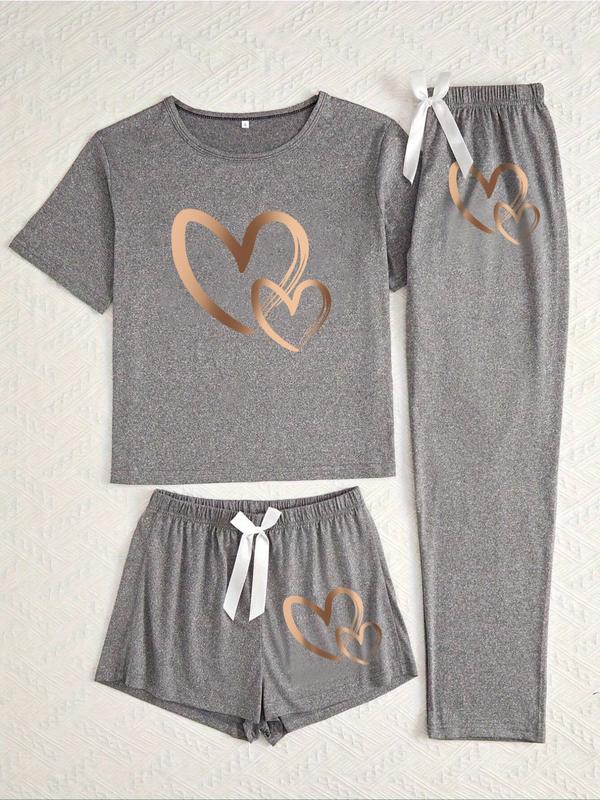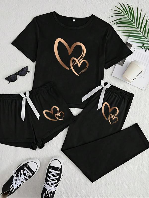 Women's Heart Print Tee & Pants & Shorts Pyjama Set, Casual Comfy Round Neck Short Sleeve T-Shirt, Ladies Sleepwear for All Seasons #unisexsweatsuits #plussizesweatsuit #valentinespajamas #twopiecepajamas #knitsleepwear #threepiececomforterset #plussizepajamas #flatteringloungewear #menspajamas #pjbottoms