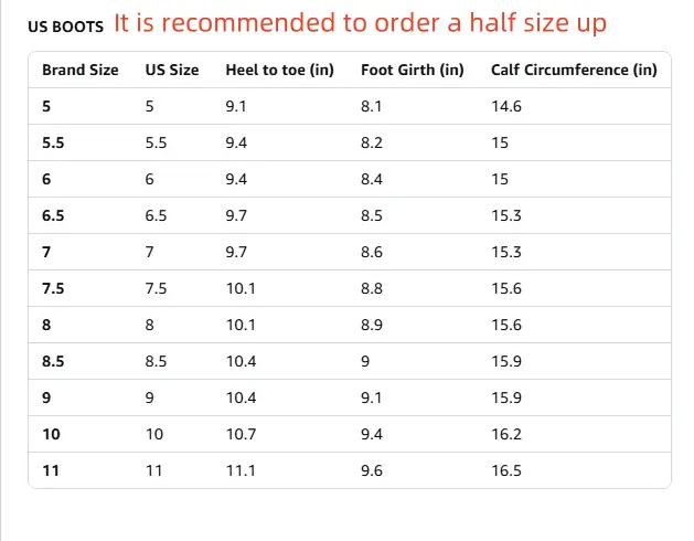 ·BUYING TIPS: It is recommended to buy boots half a size larger.(For example, if you usually wear a size 7, we recommend that you buy a size 7.5)