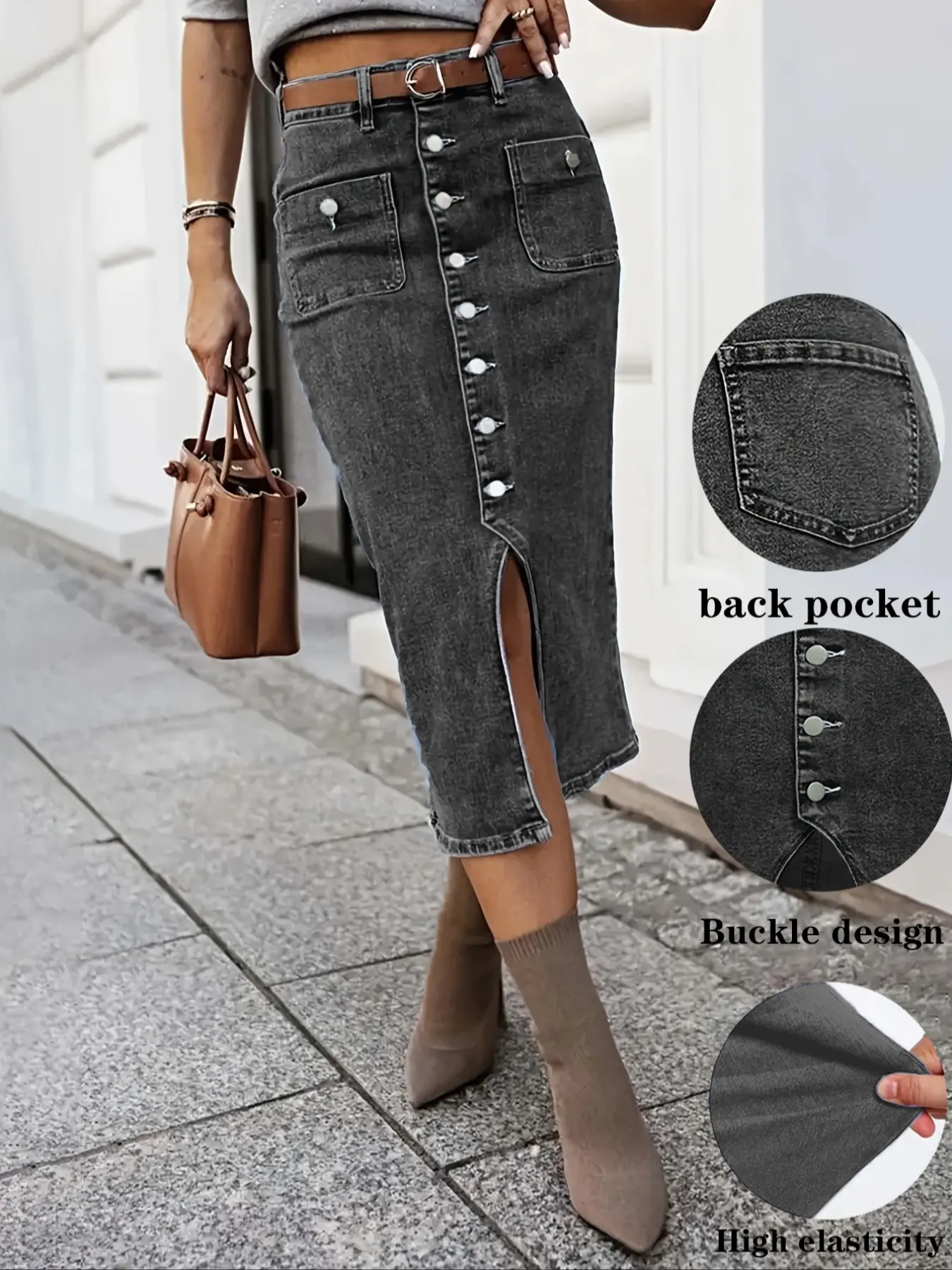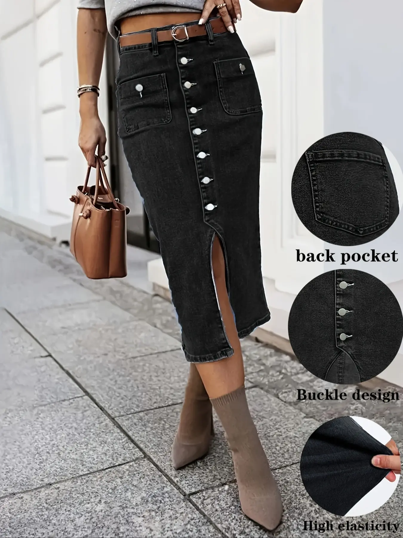 5. Women's High Elastic Dark Wash Denim Half Skirt with Button Closure, Stylish Casual Wear, Perfect for Daily, Comfortable and Trendy