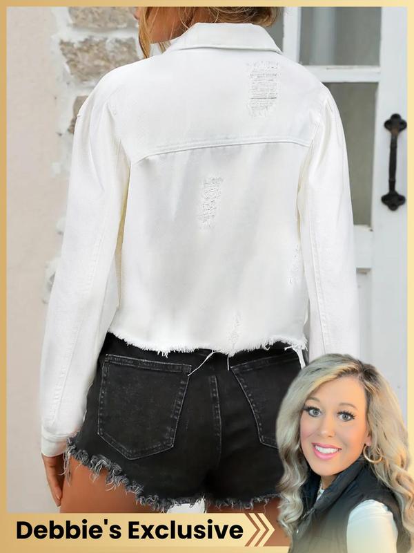 【Debbie's Exclusive】High Elasticity Denim Jacket with Fitted Design, Casual Plain Ripped Style for All Seasons, Long Sleeve Women's Outerwear