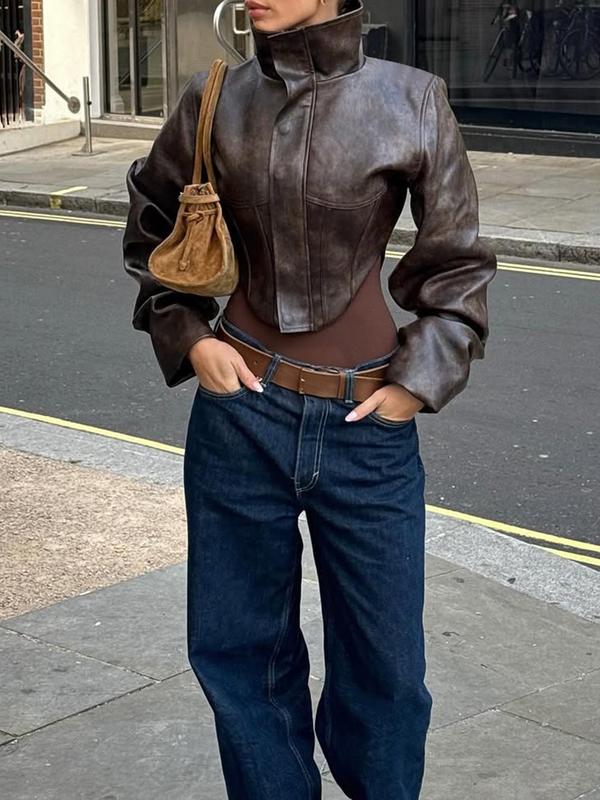 5. Women's High Neck PU Leather Jacket, Slim Fit Short Zipper Coat, Fall & Winter Fashion Outerwear, Casual Stylish Design