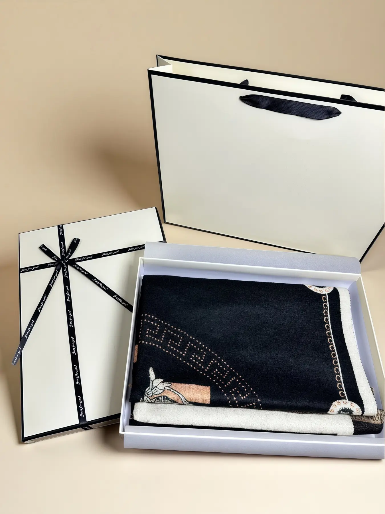 Nice box and bag expertise tho no branding. Scarf is warm and lovely.