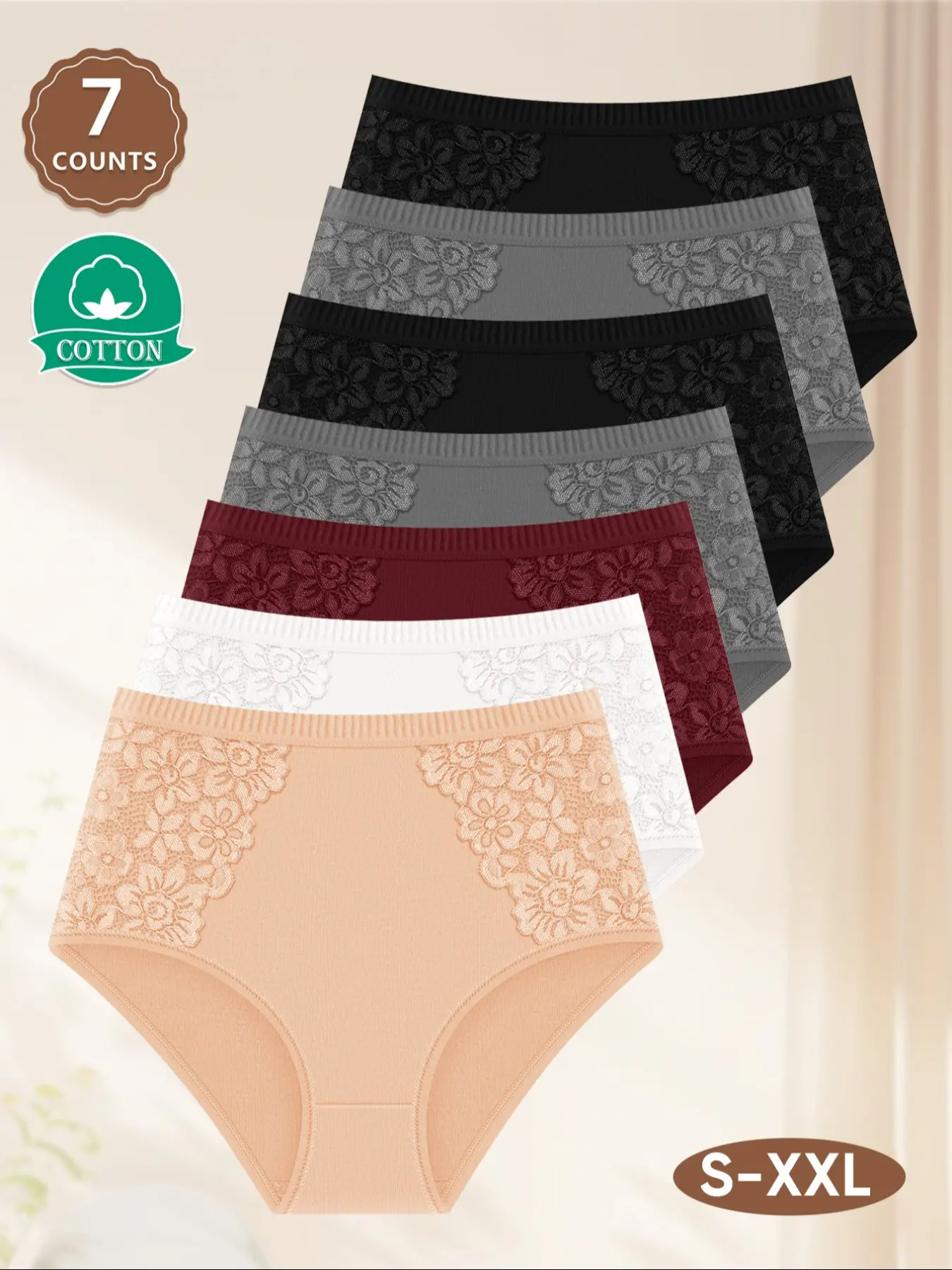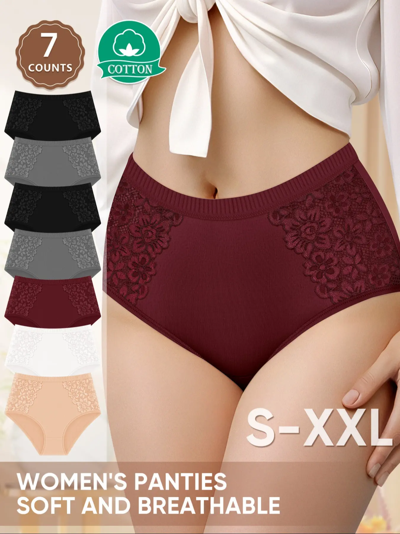 7 Pack Cotton Women's High Waist Briefs with Lace Trim, Soft Breathable Shaping Underwear for All Seasons, Comfortable Fitted Women's Panties