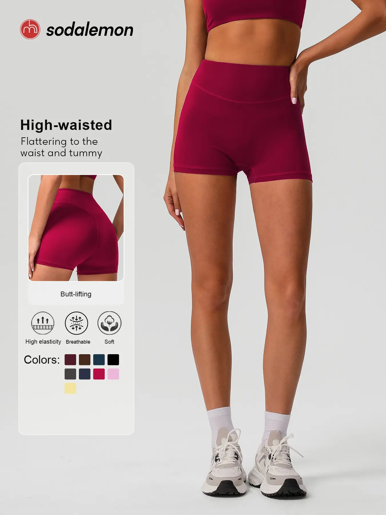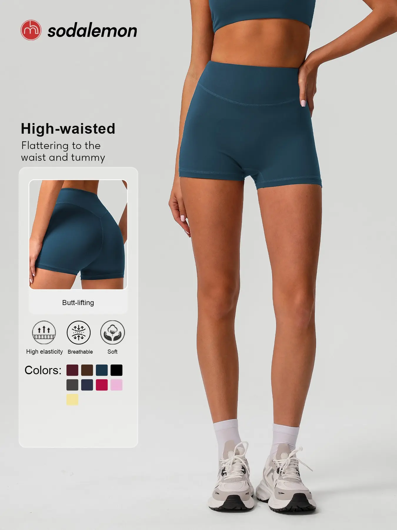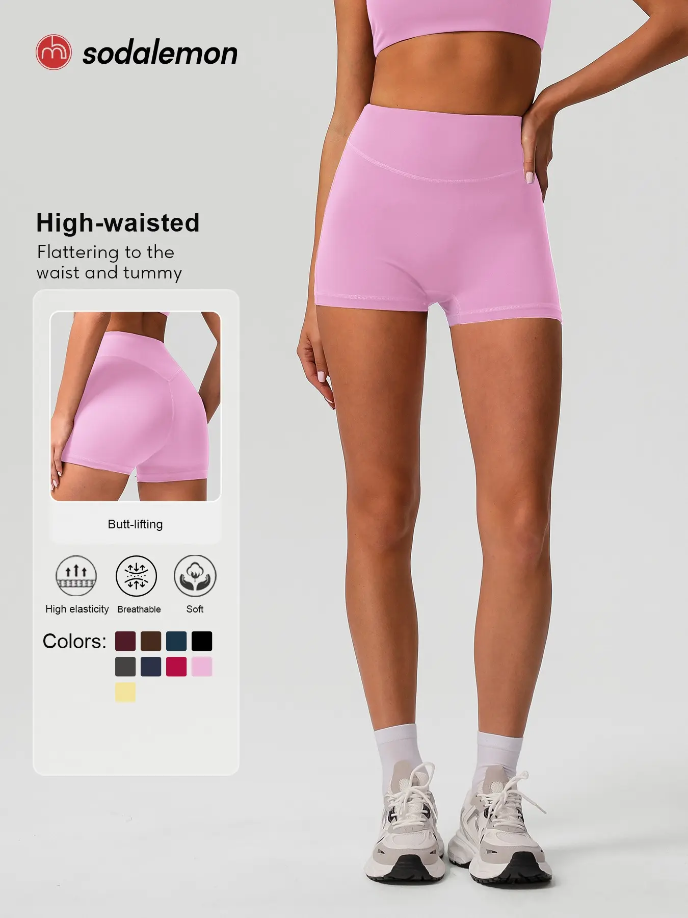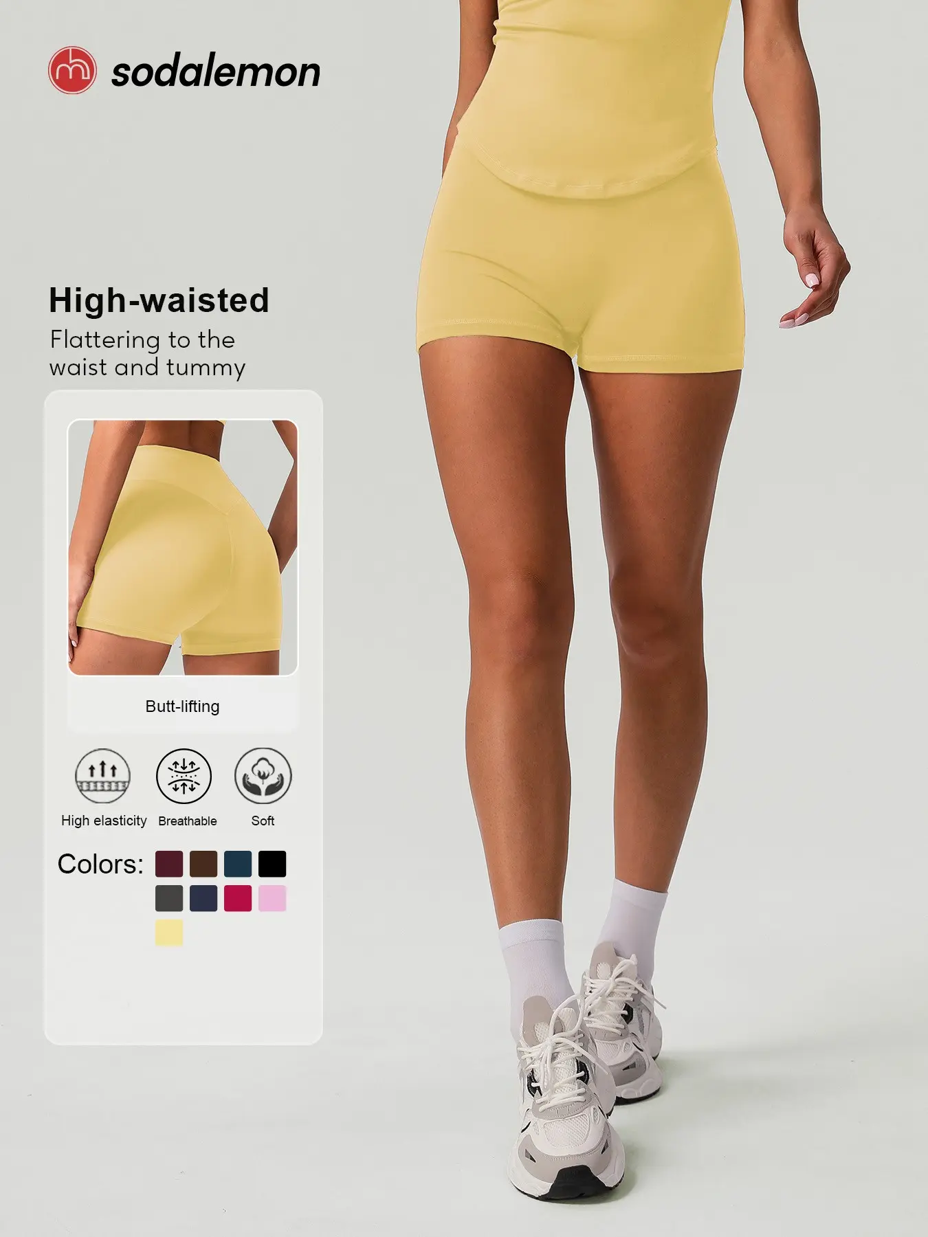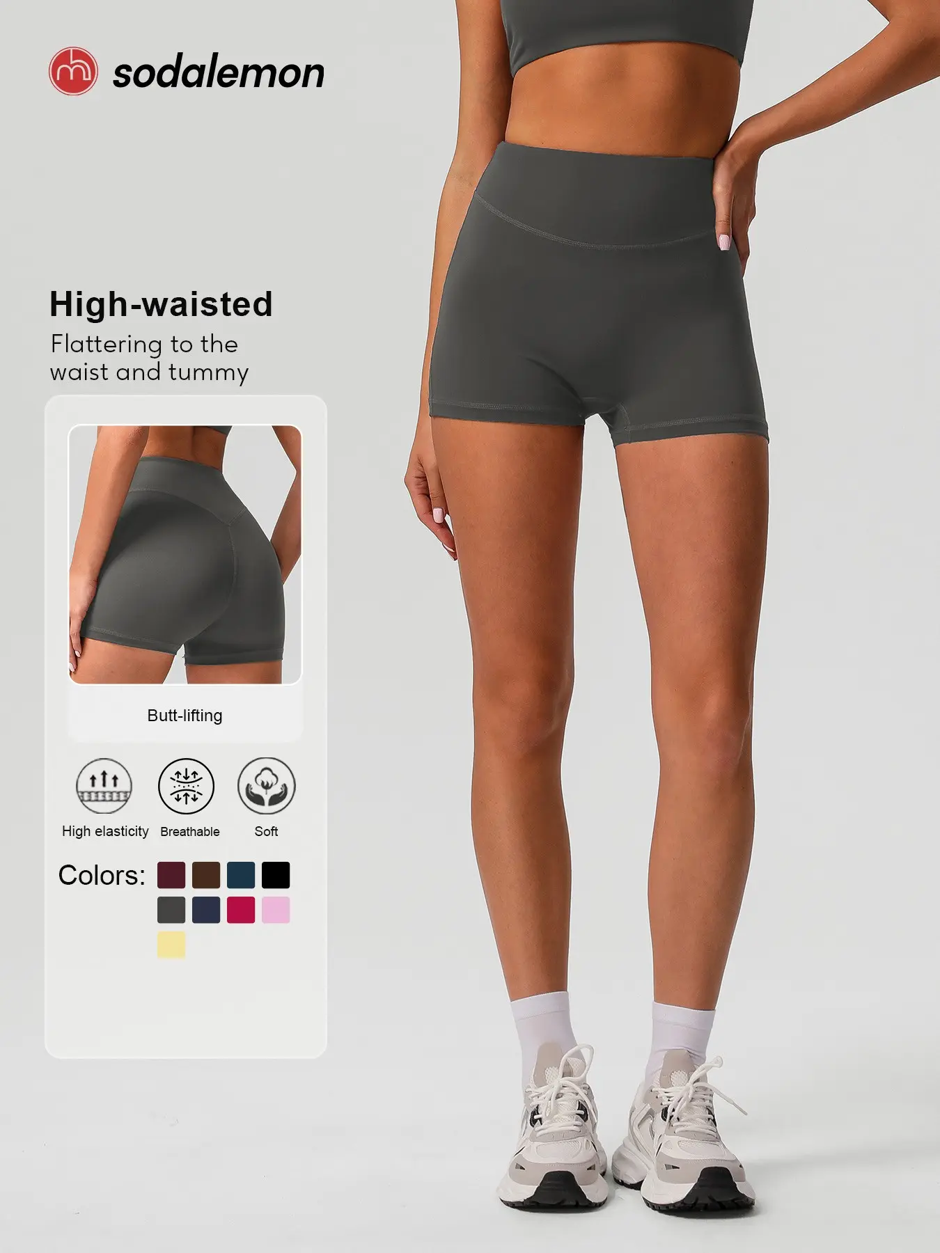 5. Sodalemon Women's Solid High Waist Gym Shorts, Casual Comfy Breathable Skinny Shorts for Yoga Gym Workout Running, Ladies Sportswear for All Seasons