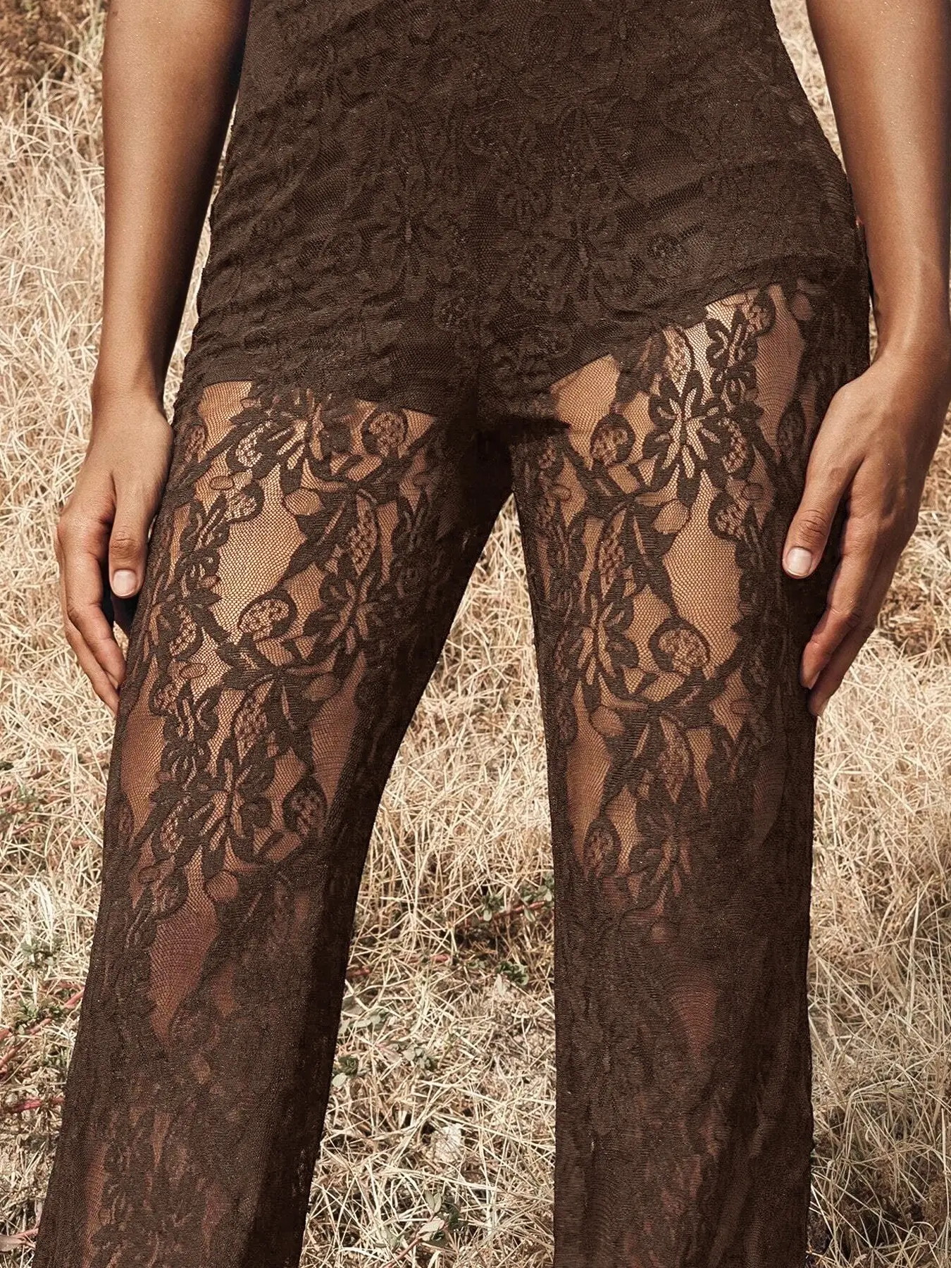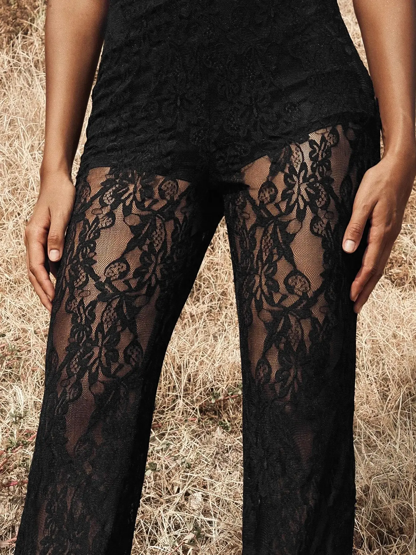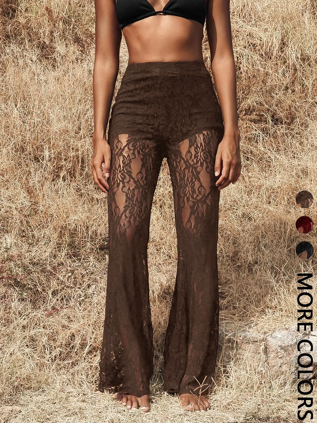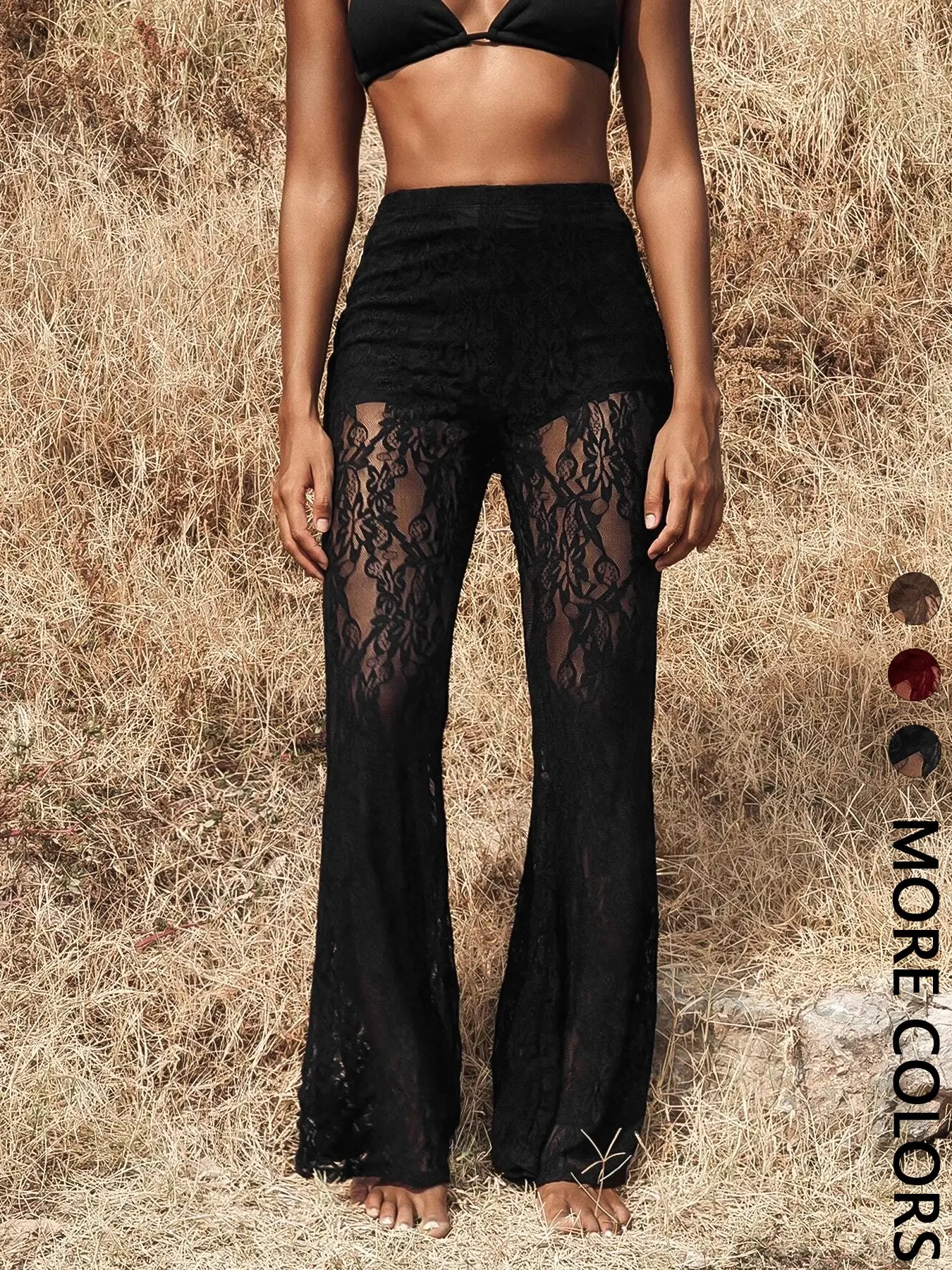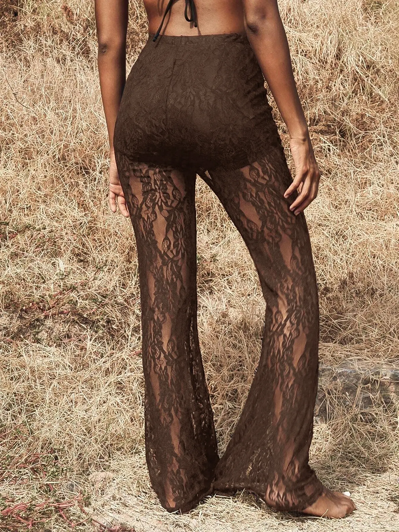 Women's High Waist Lace Knit Pants, Sexy Transparent Design, Flare Leg, Elegant Ladies' Fashion, Perfect for Daily Wear