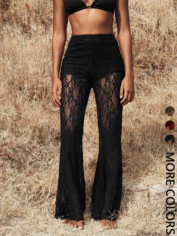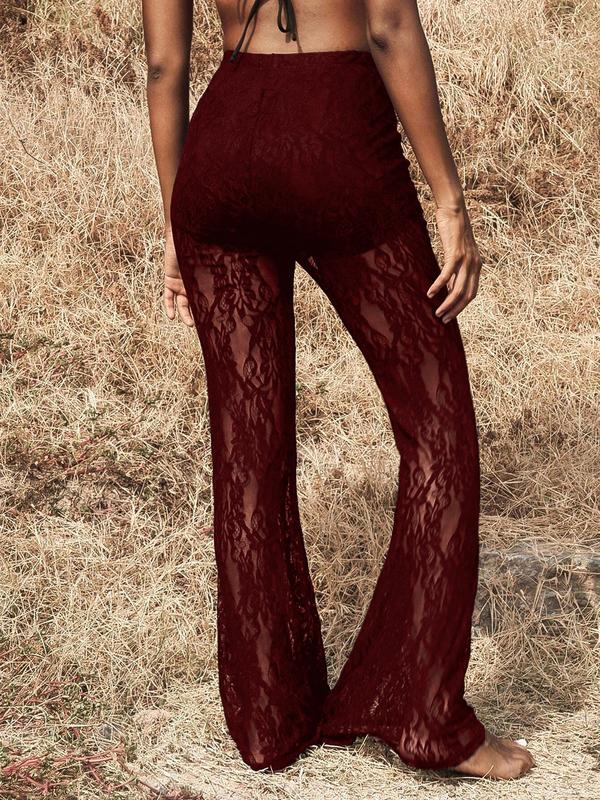 Valentine's Day Women's High Waist Lace Knit Pants, Sexy Transparent Design, Flare Leg, Elegant Ladies' Fashion, Perfect for Daily Wear