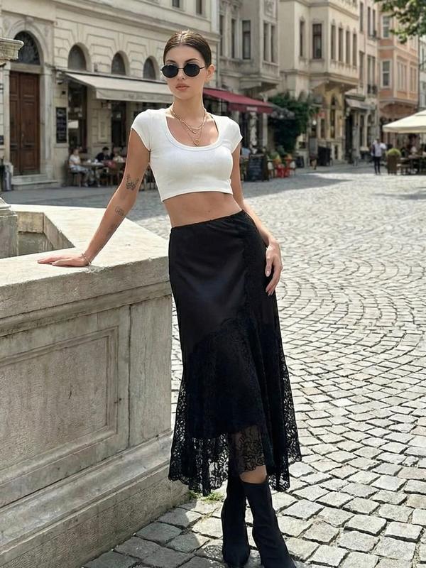 Women's High Waist Satin Lace Long Dress, Asymmetric Decor Y2K Evening Gown, Layered Elegant Midi Skirt for Spring Summer Fall Winter