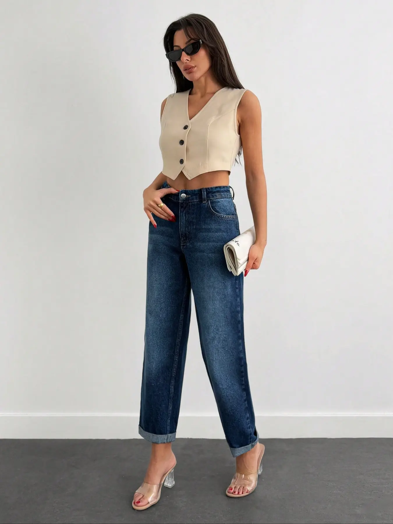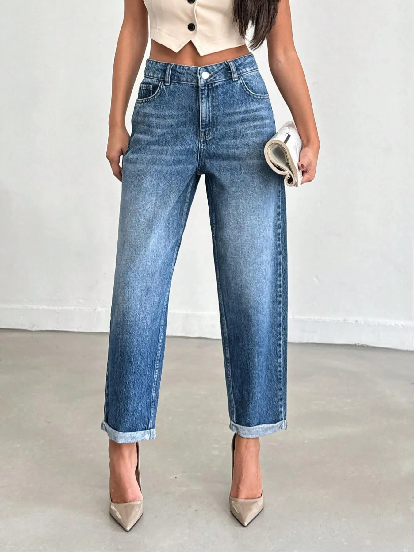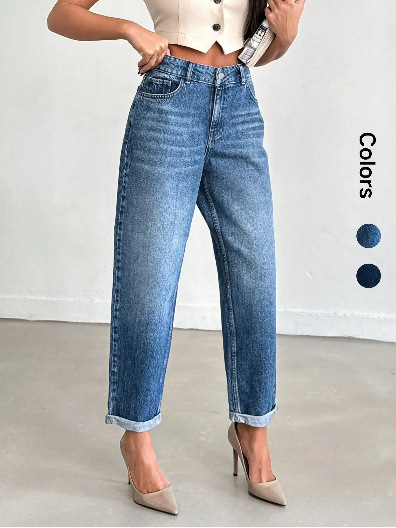 OBLue Jeans Retro High Waist Straight Leg Jeans for Women, Loose Fit with Rolled Hem for Slim Look and Style, High Waisted Denim