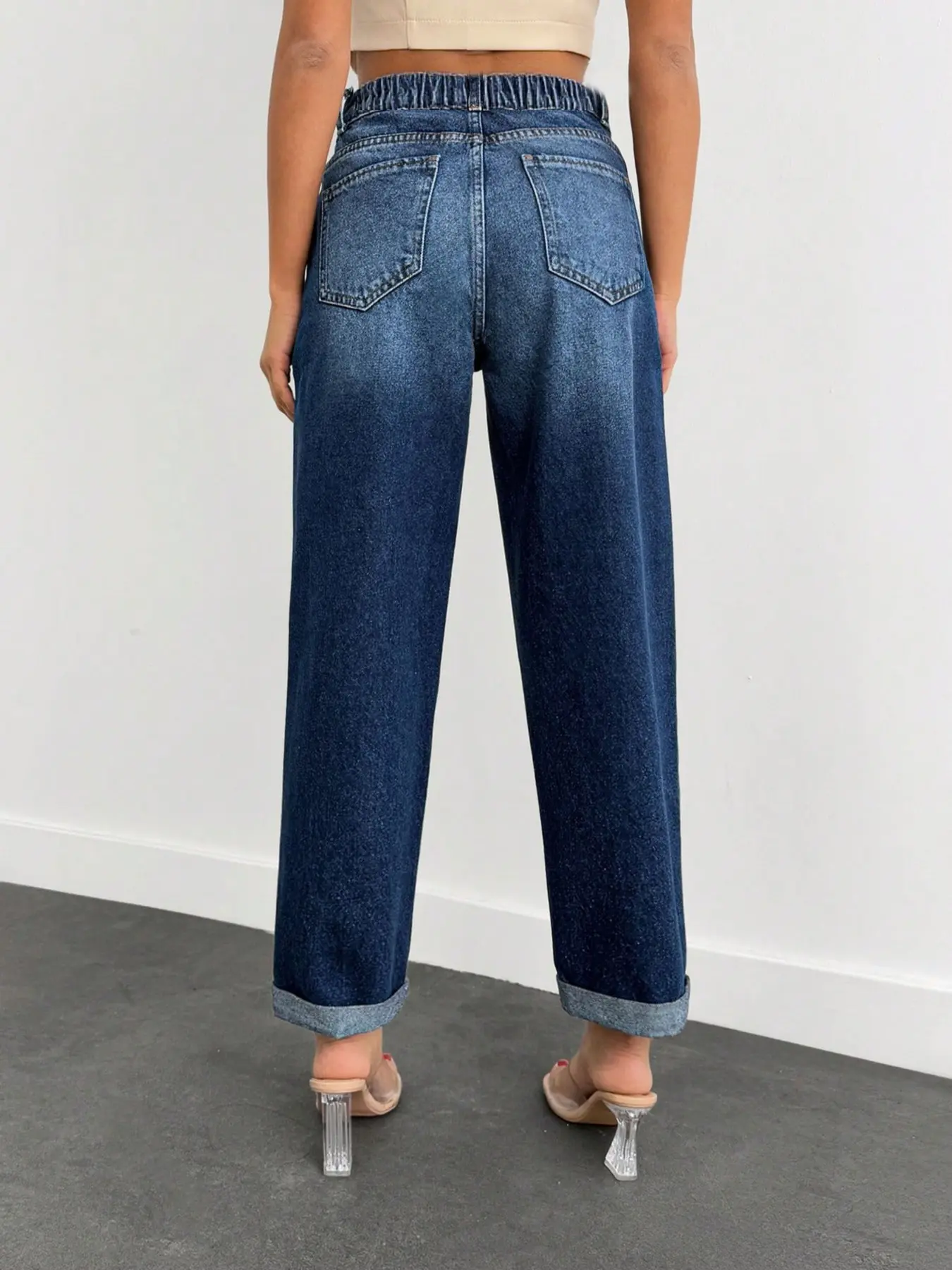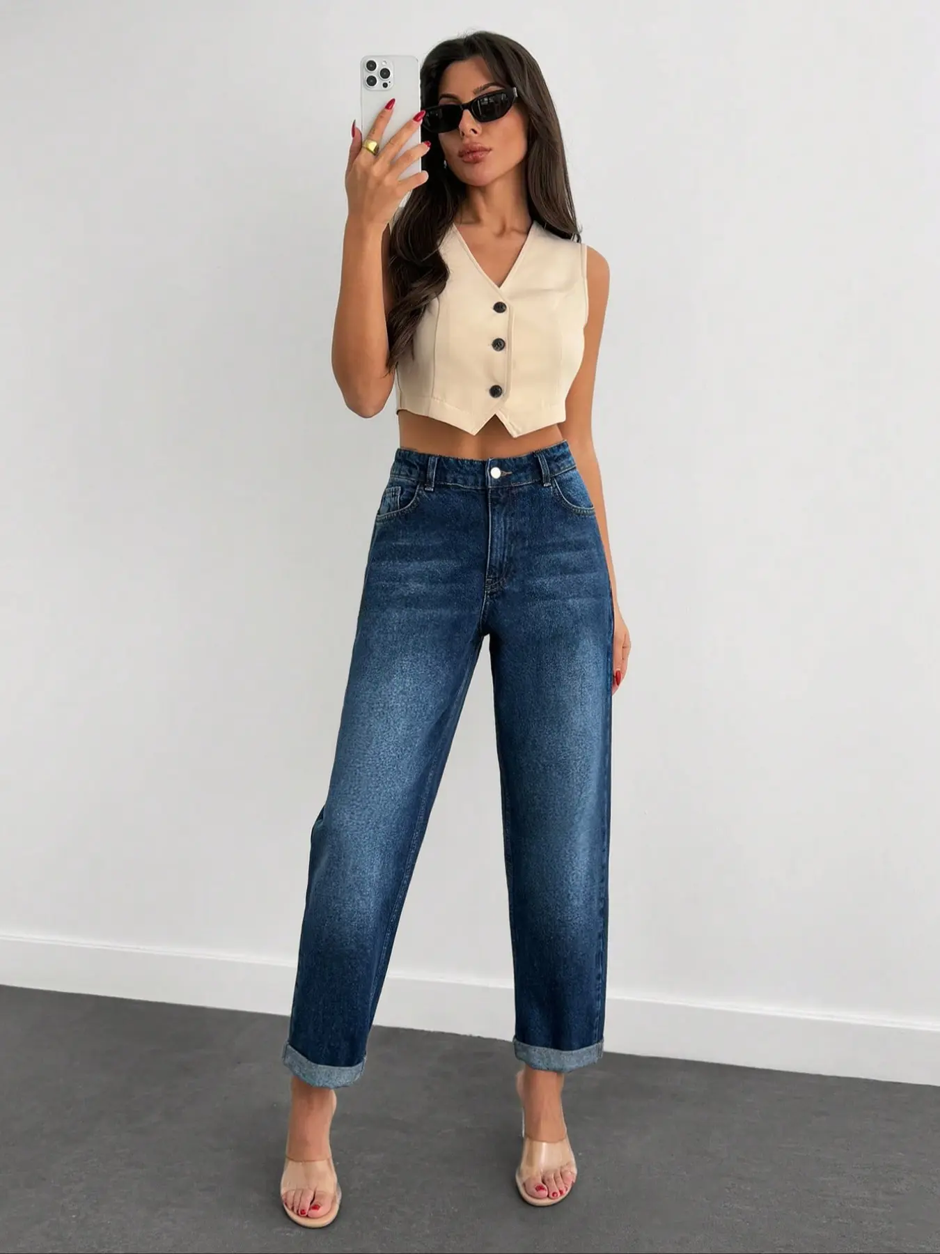 5. OBLue Jeans Retro High Waist Straight Leg Jeans for Women, Loose Fit with Rolled Hem for Slim Look and Style, High Waisted Denim