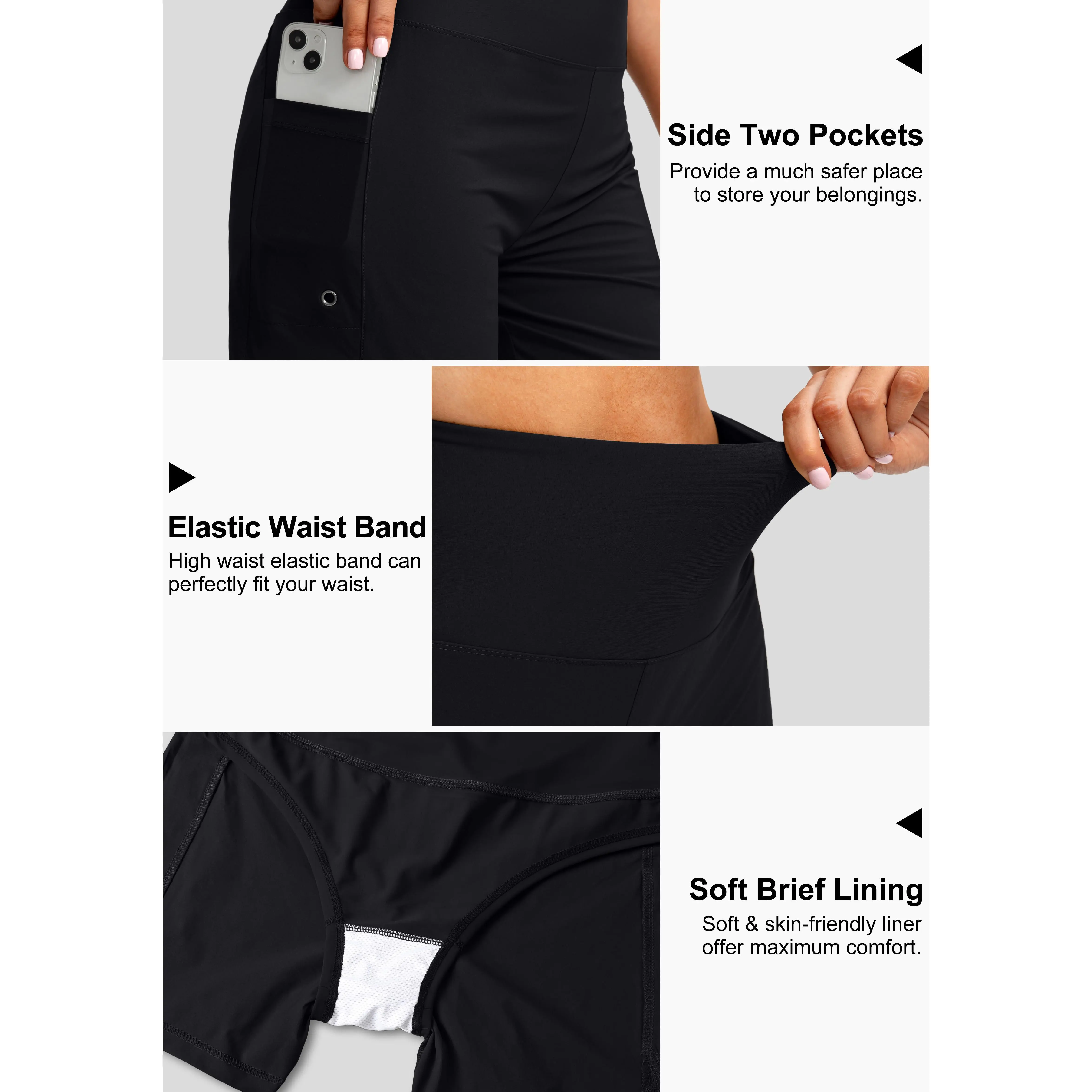 ·DOUBLE SIDE POCKETS: Functional pockets with drain hole not only store your belongings but also accelerate water flow for quick drying, and keep you hands free in swimming.