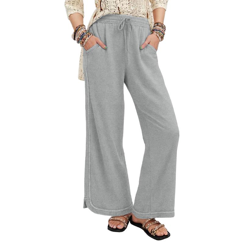 【Features】High-rise elastic waist with drawstring, side pockets, curved hem. Solid-color wide-leg cut flatters all figures and allows unrestricted movement.