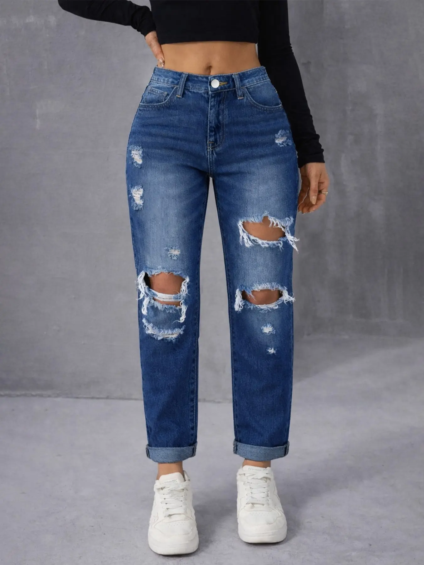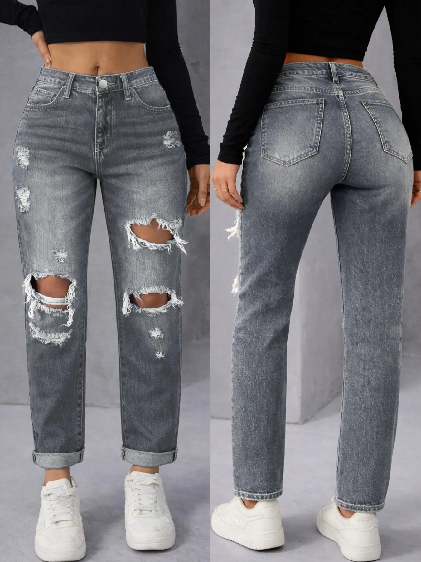 【High Waist Fit】: These jeans feature a high waist design, providing a flattering fit and added support for all-day wear.