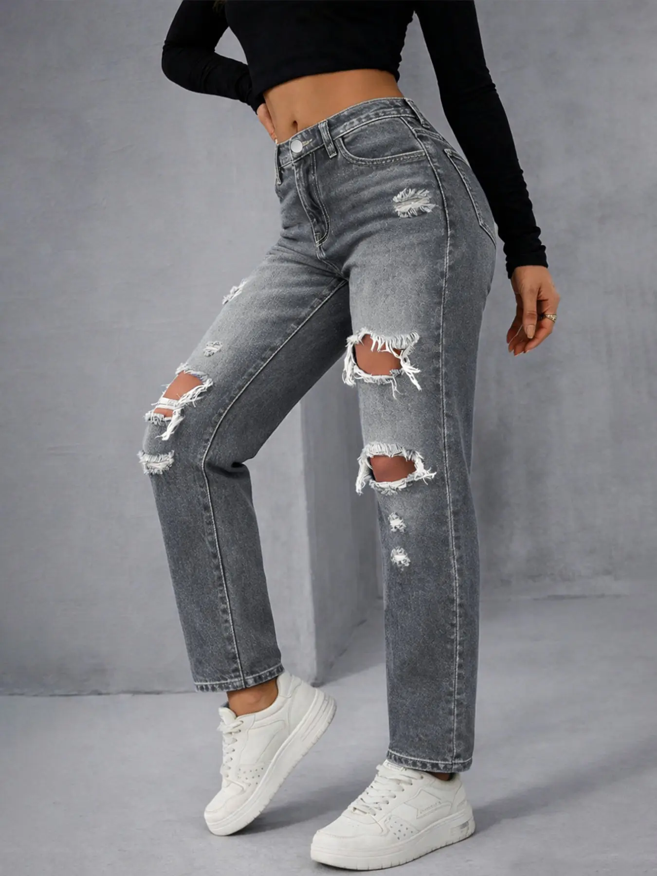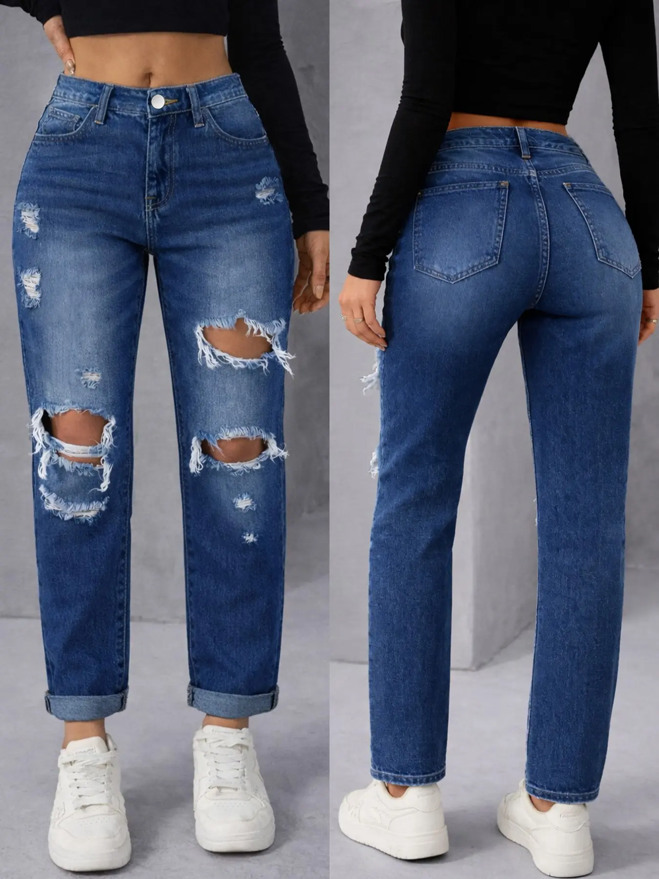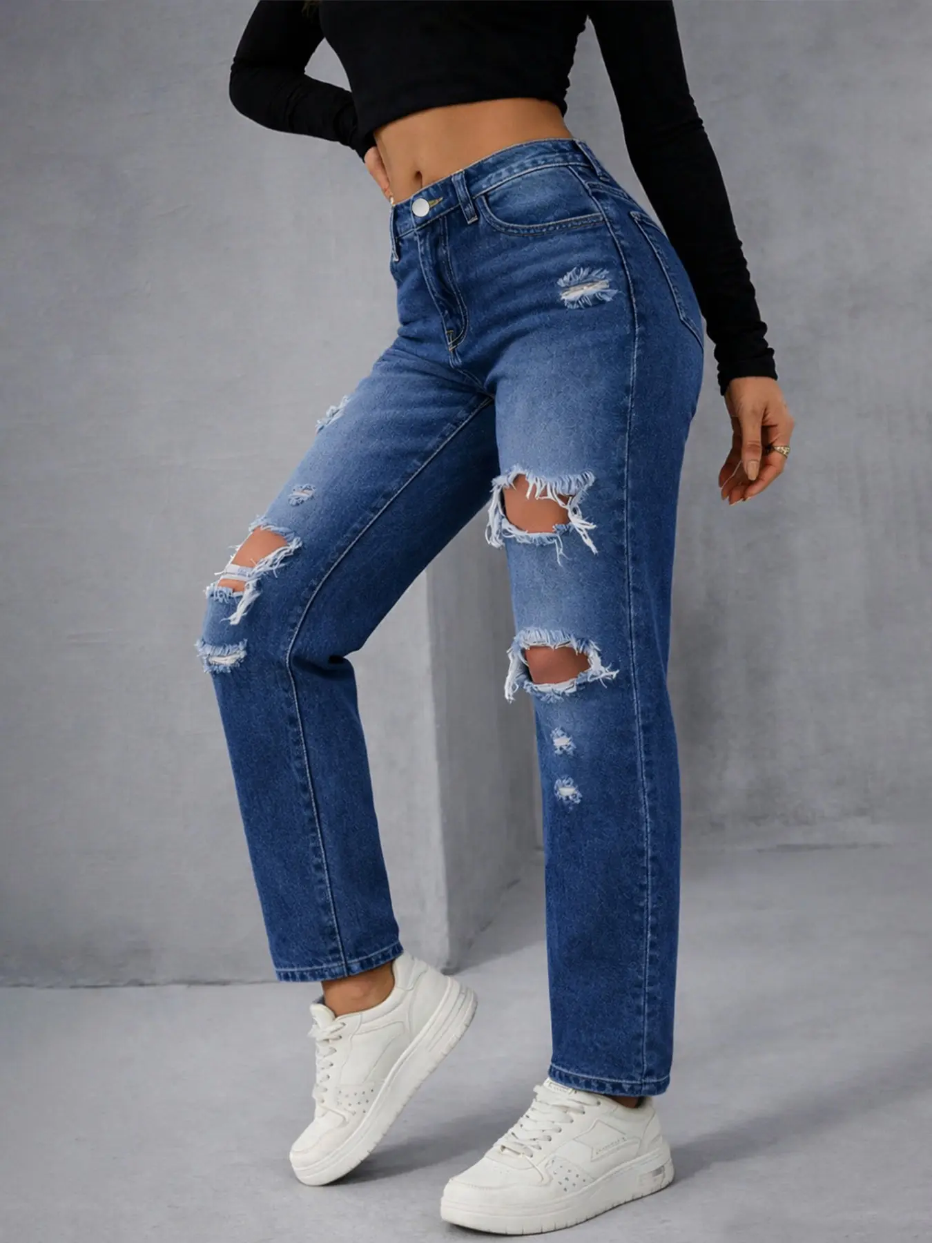 5. Women's High-Waisted Denim Jeans, Spring & Fall Casual Fitted Straight-Leg Pants, Blue Washed Street Style Distressed Design