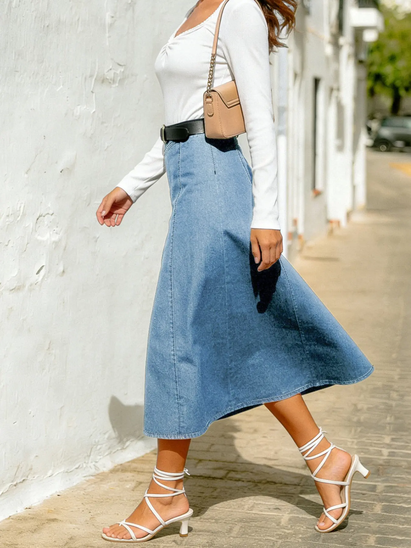 Women's High-Waisted Denim Skirt, Basic Spring & Fall Casual Style, Fitted Design, Solid Color, Long Umbrella Cut, Perfect for Daily WearWomen's High-Waisted Denim Skirt, Basic Spring & Fall Casual Style, Fitted Design, Solid Color, Long Umbrella Cut, Perfect for Daily WearWomen's High-Waisted Denim Skirt, Basic Spring & Fall Casual Style, Fitted Design, Solid Color, Long Umbrella Cut, Perfect for Daily Wear