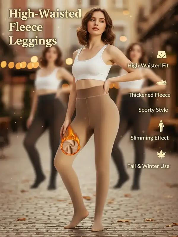 Women's High-Waisted Thicken Fleece Leggings, Stretchy High Waist, High Waist Compression, Sporty Style, Plain Pattern, Fall & Winter Wear, Slimming Warm Fake Sheer Stockings