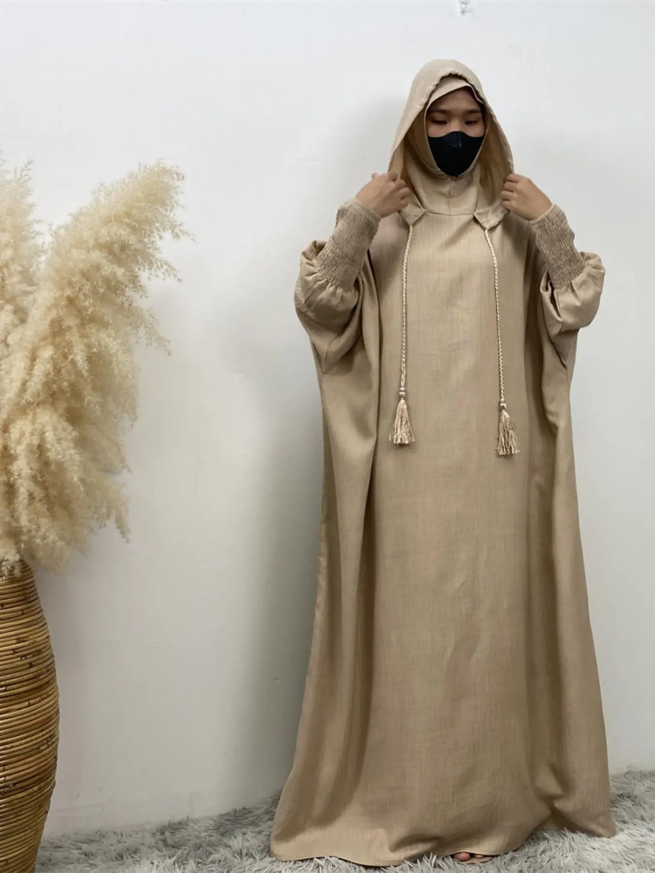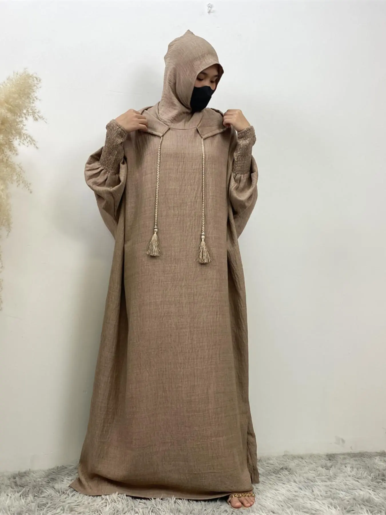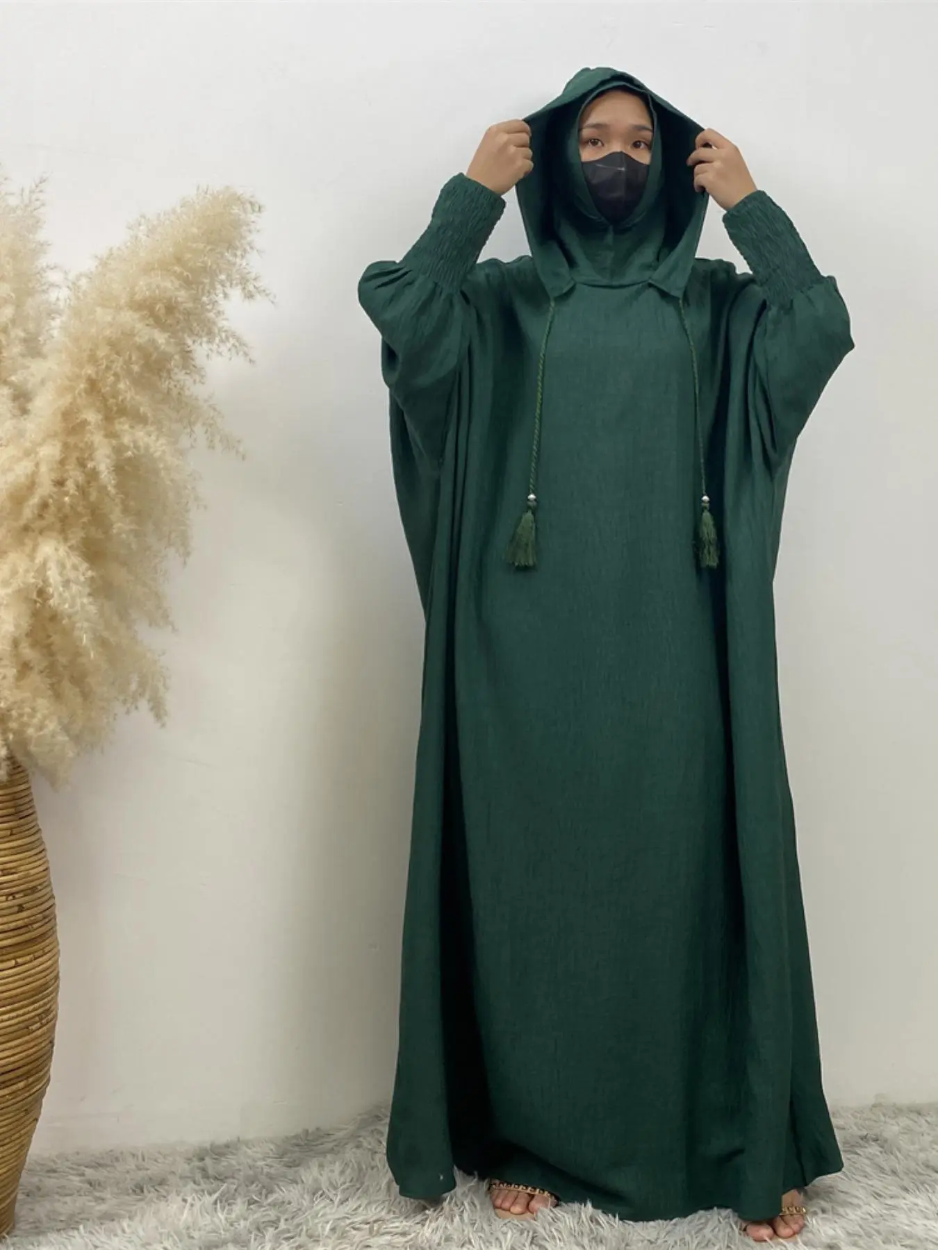 Women's Solid Color Batwing Sleeve Drawstring Hooded Dress, Casual Long Sleeve Shirred Cuff Long Dress for Spring & Fall, Women's Islamic Clothing for Daily Wear, Hooded Arabian Dress