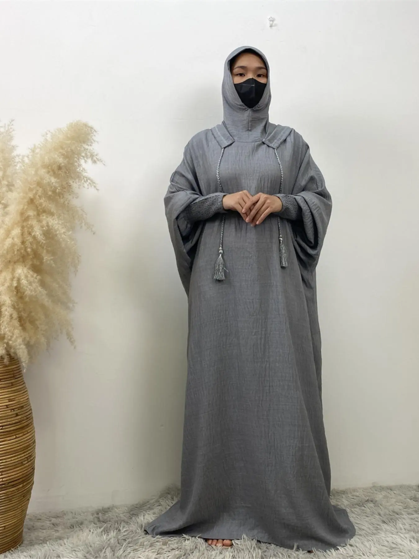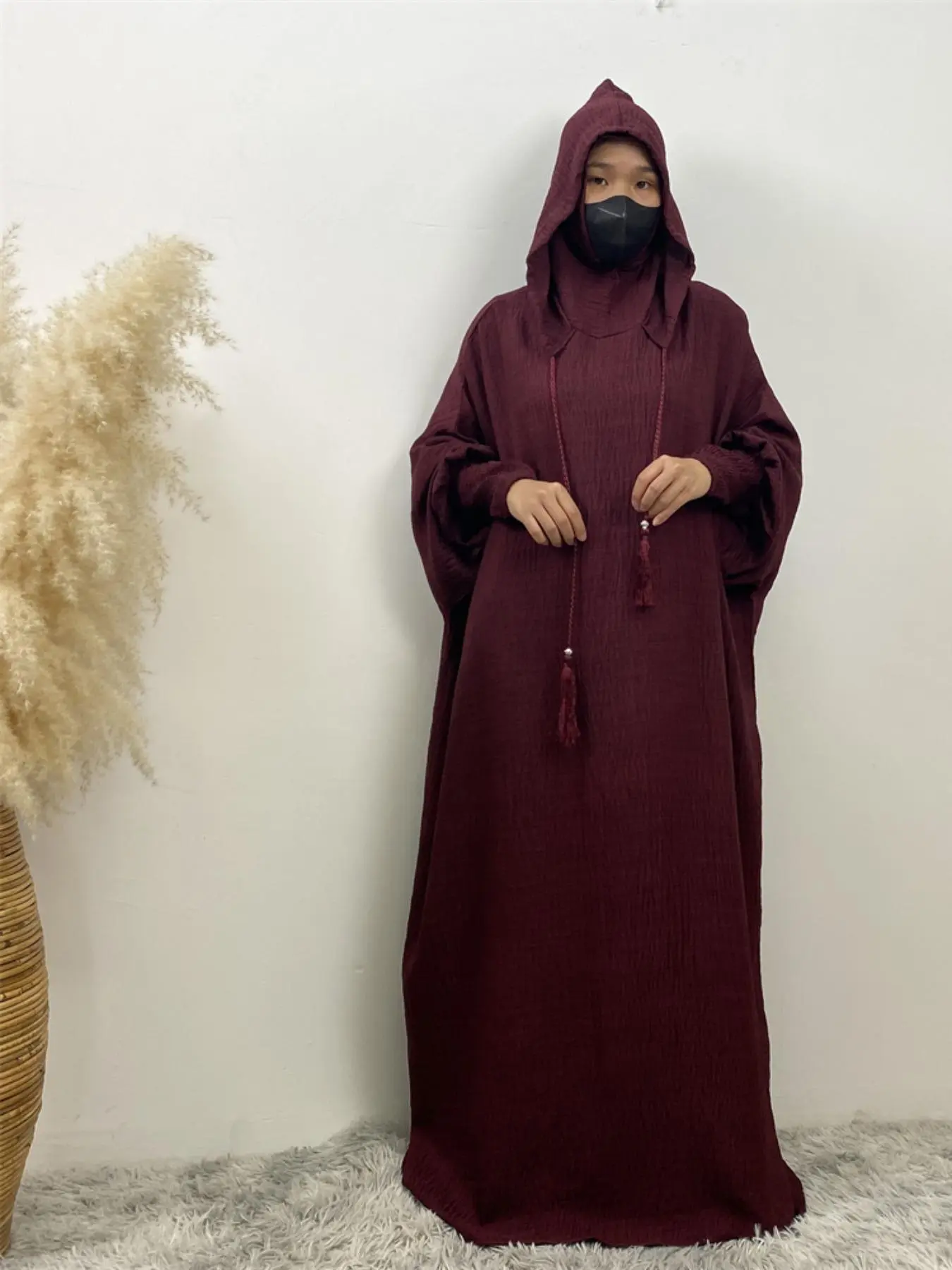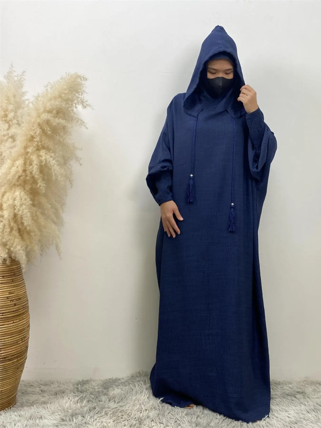 Women's Solid Color Batwing Sleeve Drawstring Hooded Dress, Casual Long Sleeve Shirred Cuff Long Dress for Spring & Fall, Women's Islamic Clothing for Daily Wear, Hooded Arabian Dress