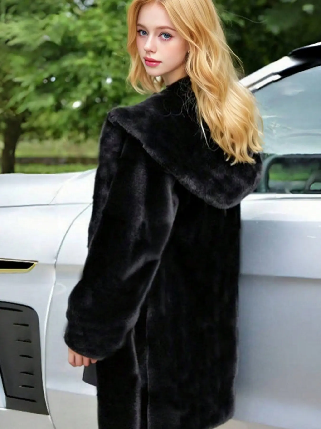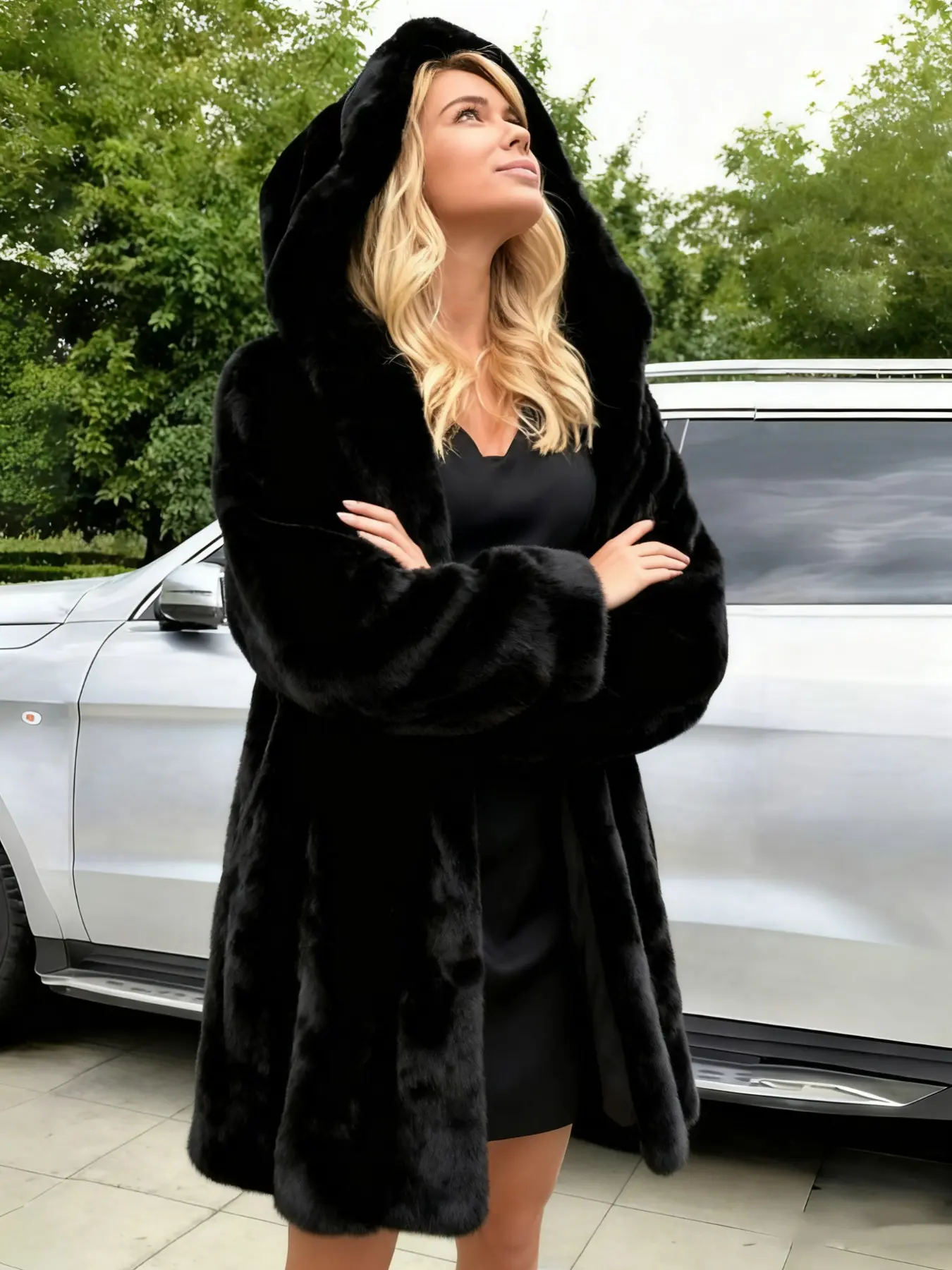 5. Women's Hooded Faux Fur Coat, Loose Mid-Length Luxurious Plush Jacket, Soft Puffy Texture, Elegant Fall Winter Outerwear