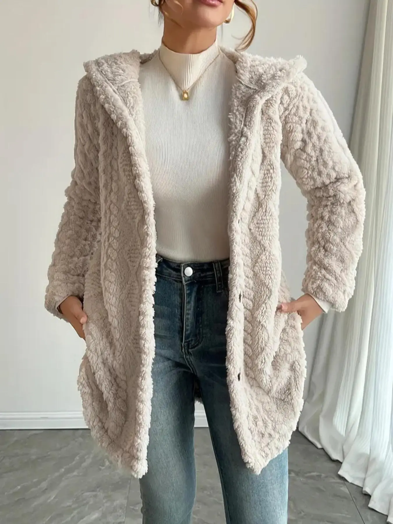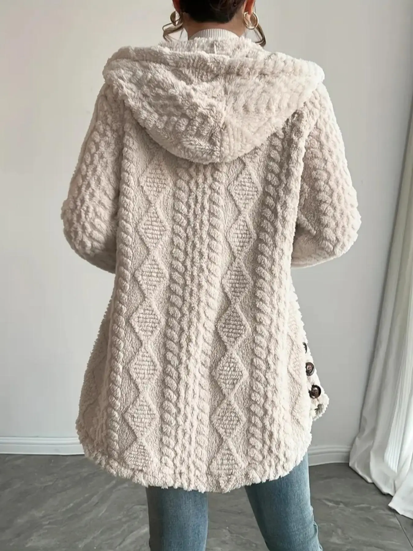 Women's Fall Winter Warm Hooded Plush Jacket, Soft Textured Button Front Coat, Casual Loose Fit Outerwear for Daily Wear #plushjacket #wintercoat #fallfashion #cozyfashion #womensfashion