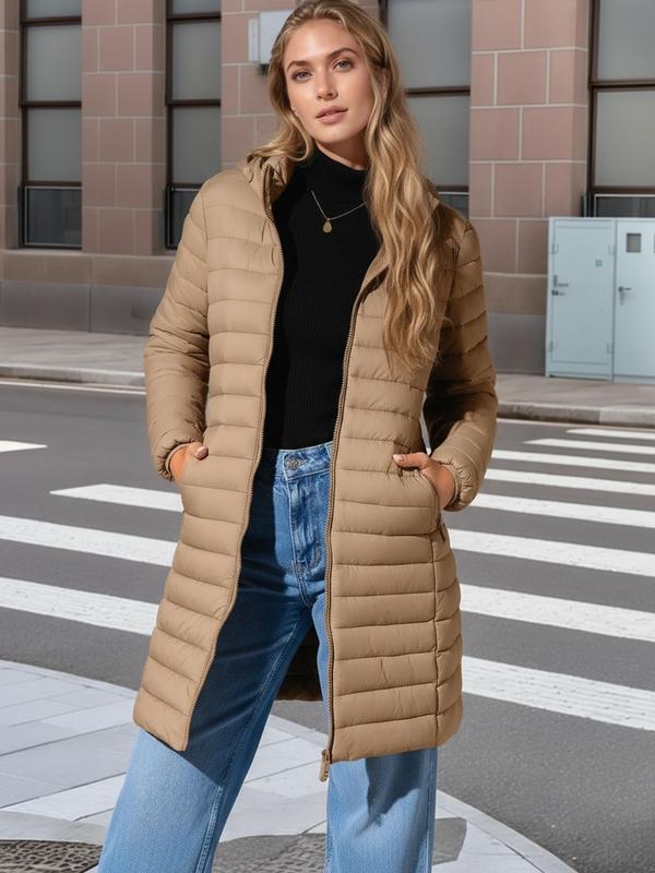 5. Women's Mid-Length pufferHooded Jacket with Zipper Pockets, Casual Plain Woven Fabric Coat for Fall & Winter Outdoor Commuting