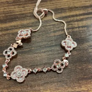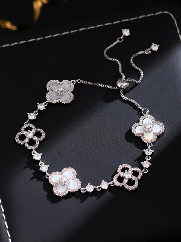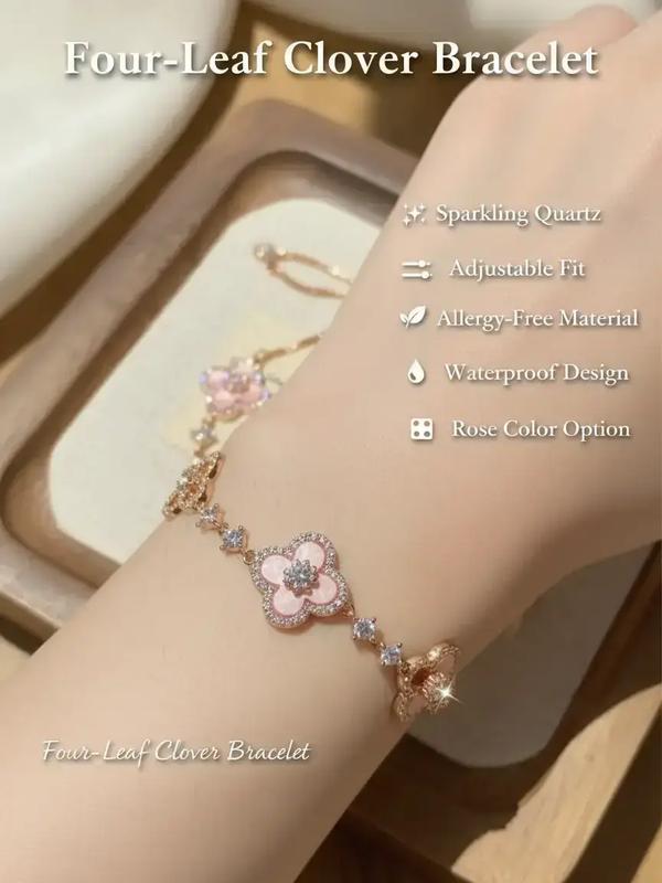Women's Four-Leaf Clover Bracelet with Sparkling Quartz, Adjustable Allergy-Free Waterproof Design, Rose Option Available, Flower Design Bracelet