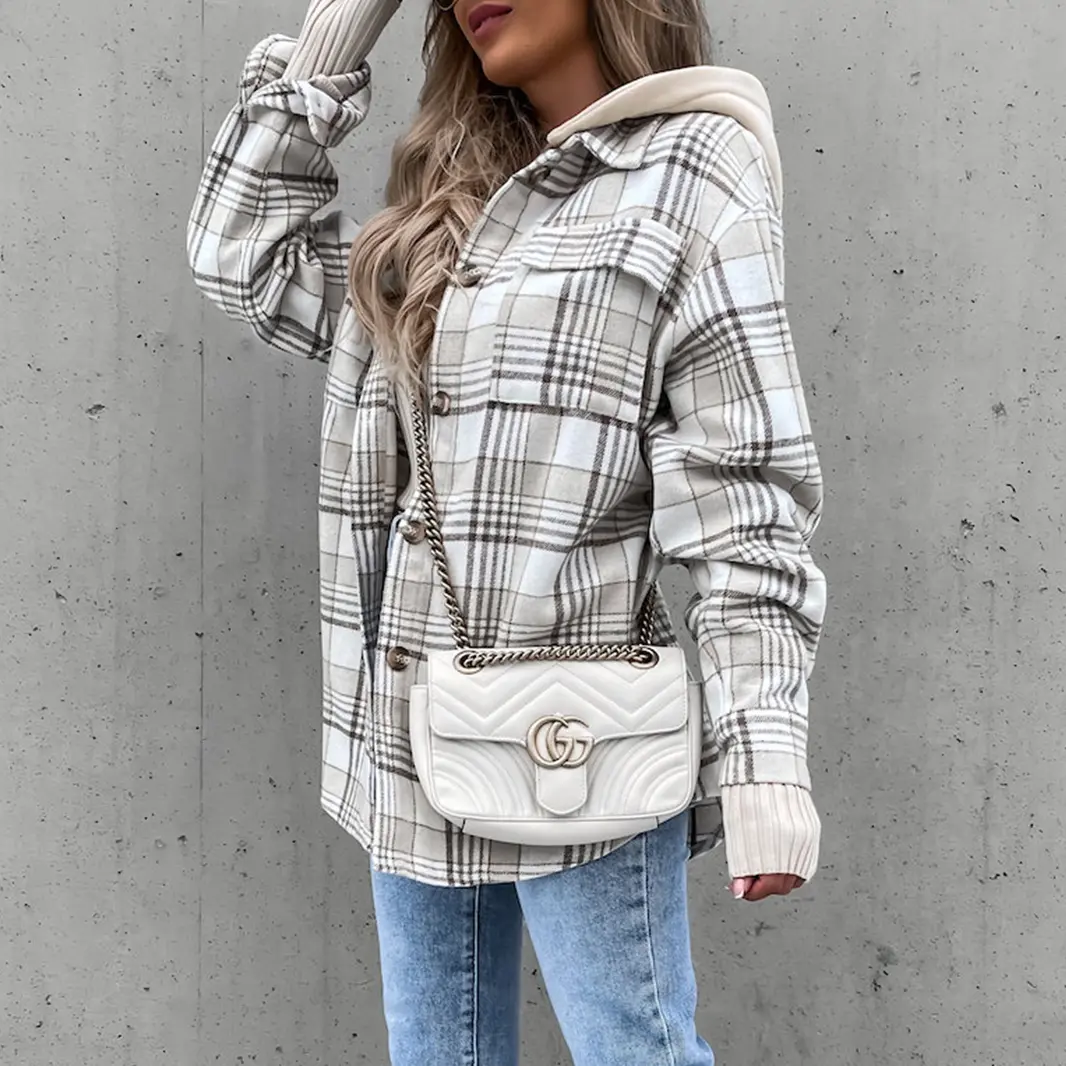 Womens Jacket Button Down Jacket with Hood Plaid Hoodie Coats